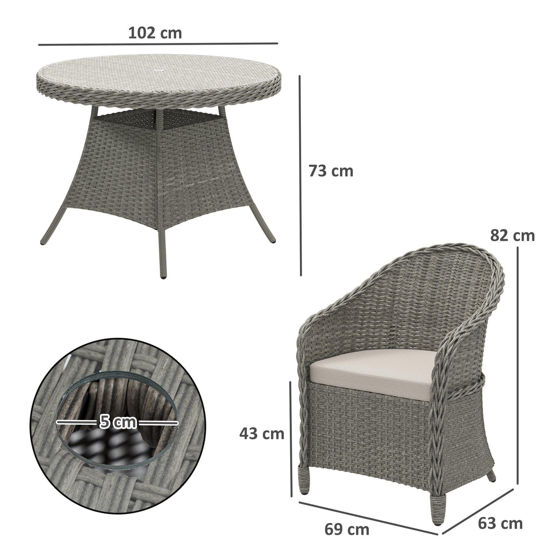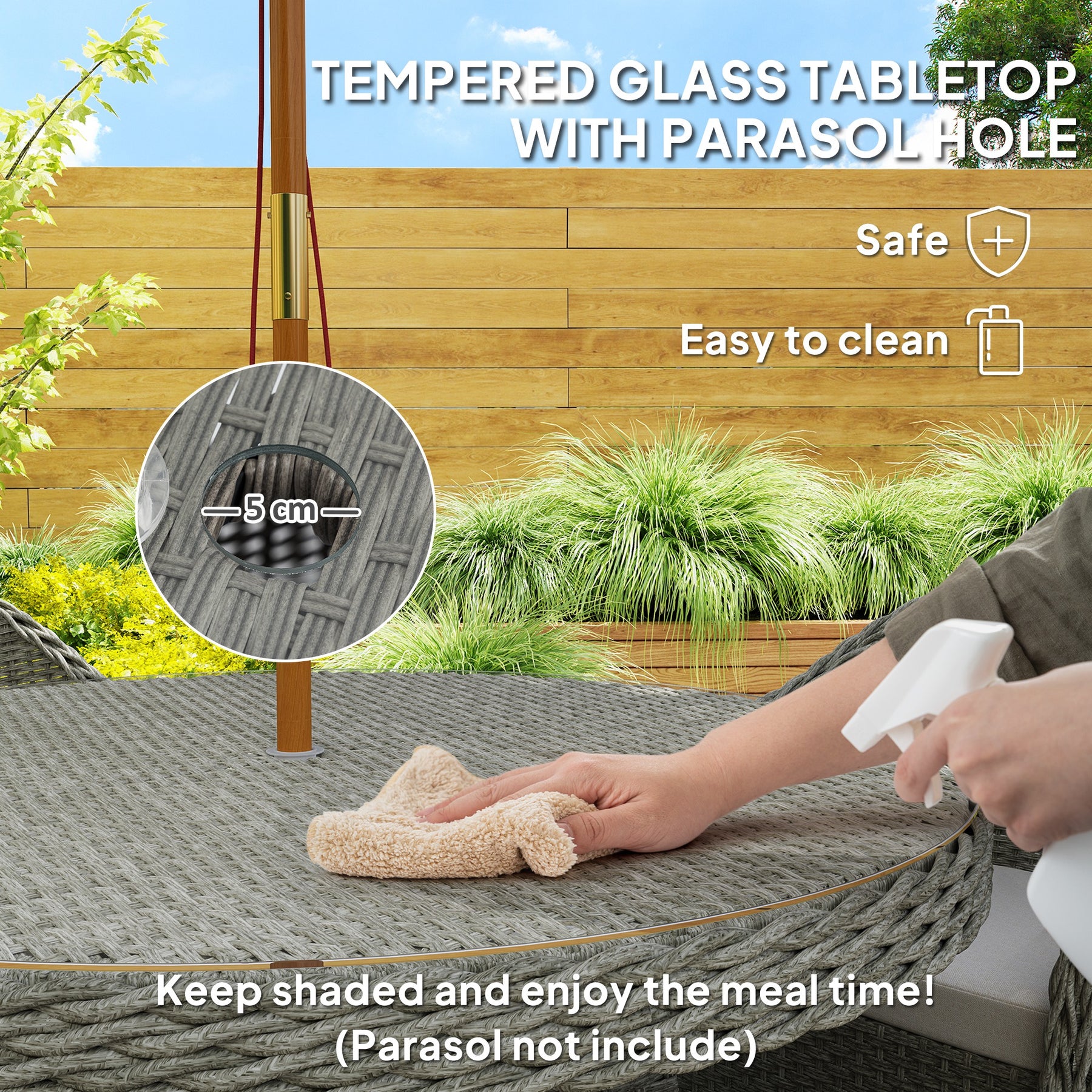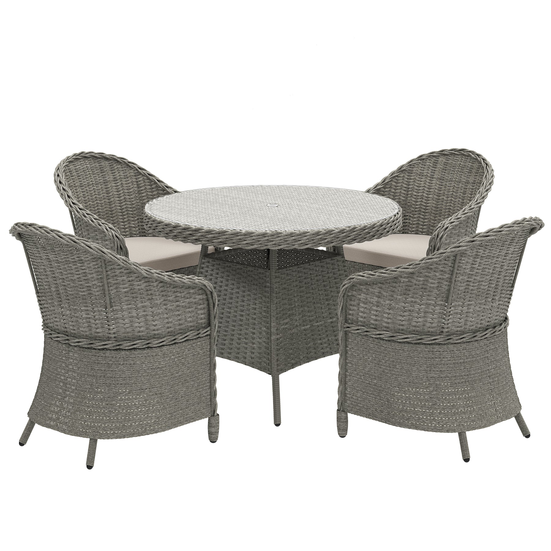Gathering guests around this season and beyond, don't come as stylish as this. The rattan dining set pairs a sleek glass-top table with on-trend grey rattan for a welcome addition to your garden and outdoor areas. Comes with four armrest chairs, each with a padded seat cushion for comfort and high back and armrests for support. The middle hole in the table of the rattan garden dining set offers a place for a parasol to keep you safely shaded. Relax in comfort and style with .