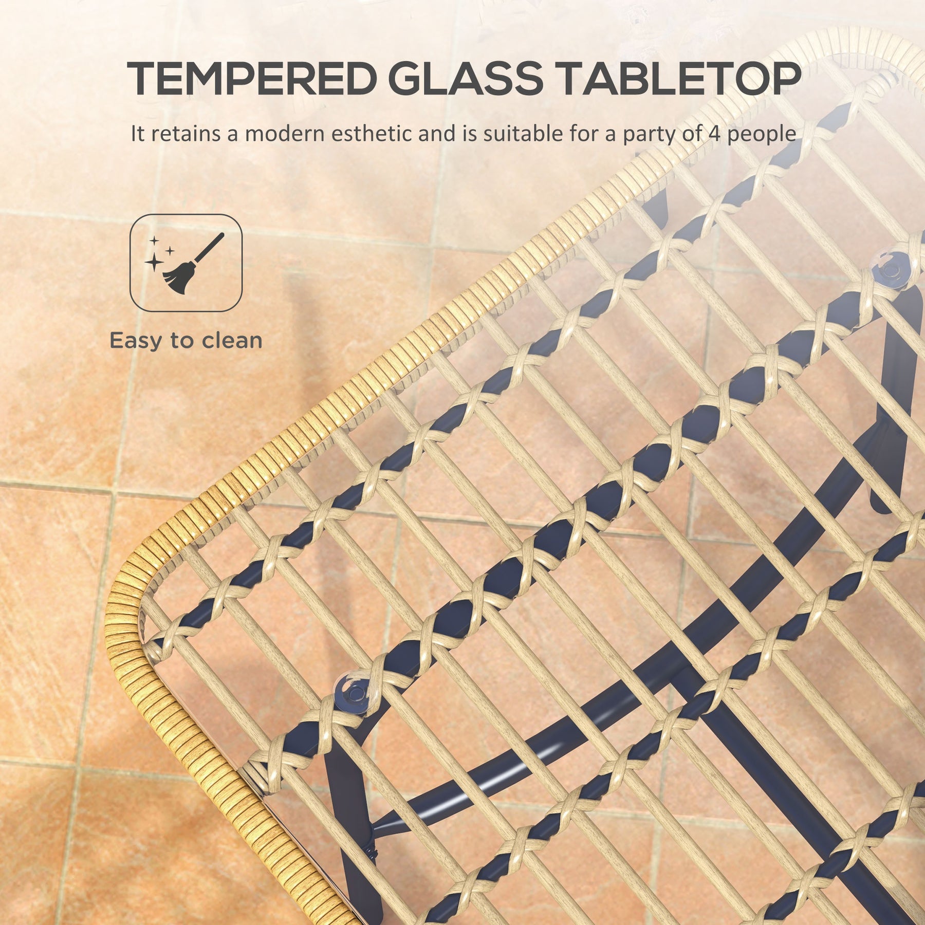 Bring style and relaxation into your outdoors with this five-piece outdoor dining table and chairs. Comes with four chairs and a dining table. The cut-out rattan design is a hollowed cube design, for a unique look. The tempered glass tabletop is a solid and safe dining surface. Elevate your outdoors with this set.