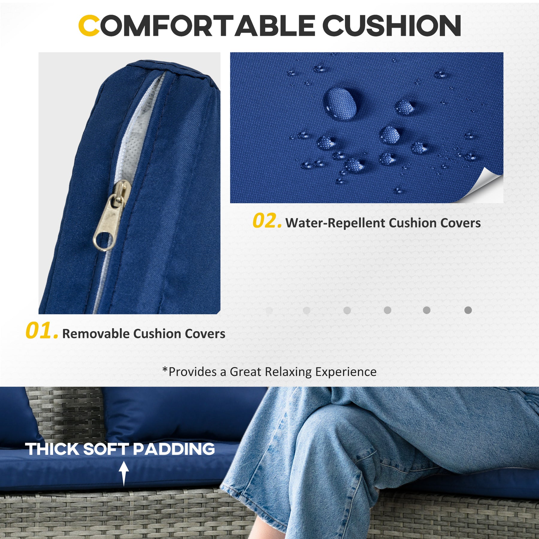 - Cushion covers with zips are removable and washable