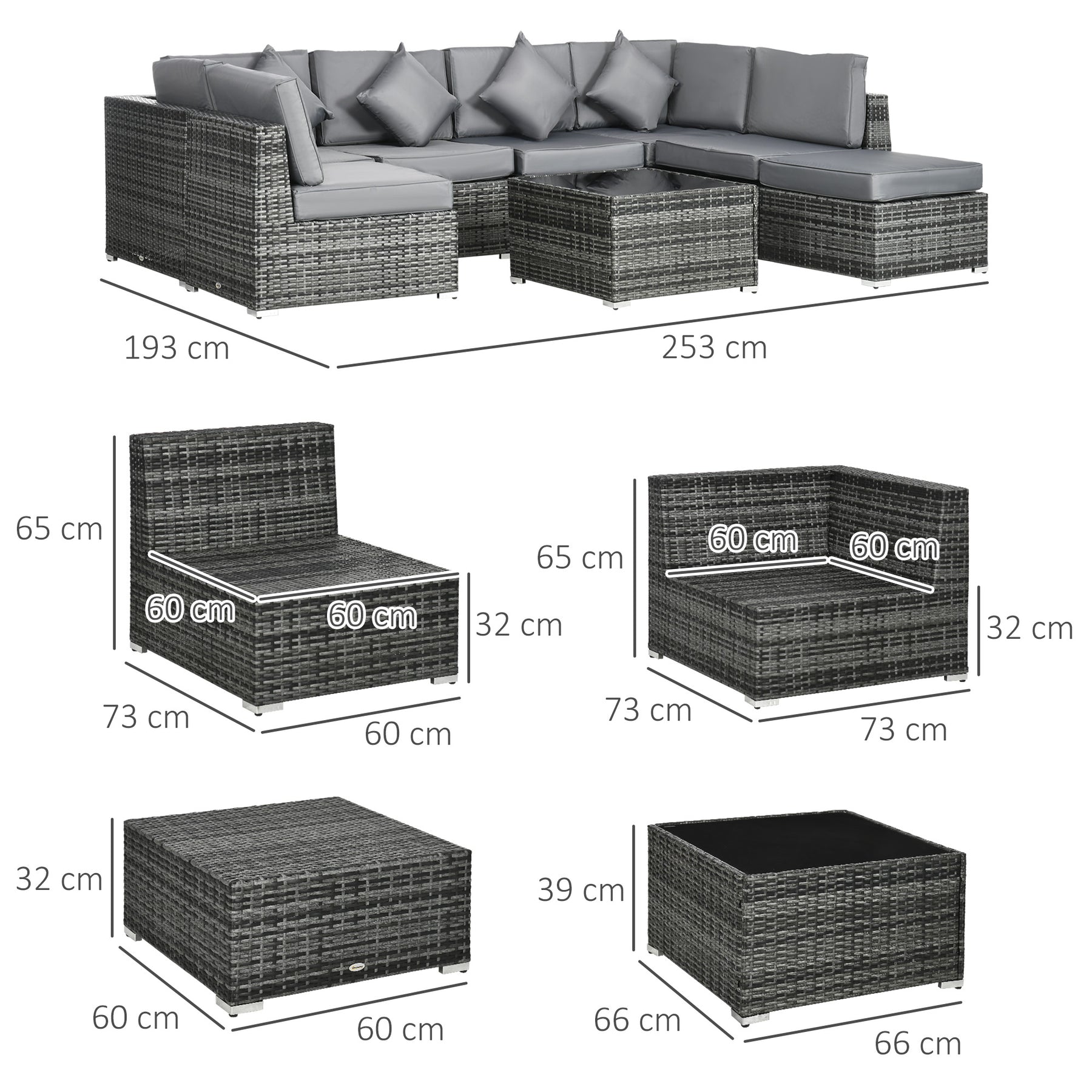 8 Pieces PE Rattan Corner Sofa Set, Outdoor Garden Furniture Set, Patio Wicker Sofa Seater w/ Cushion, Washable Cushion Cover & Tempered Glass Table, Grey