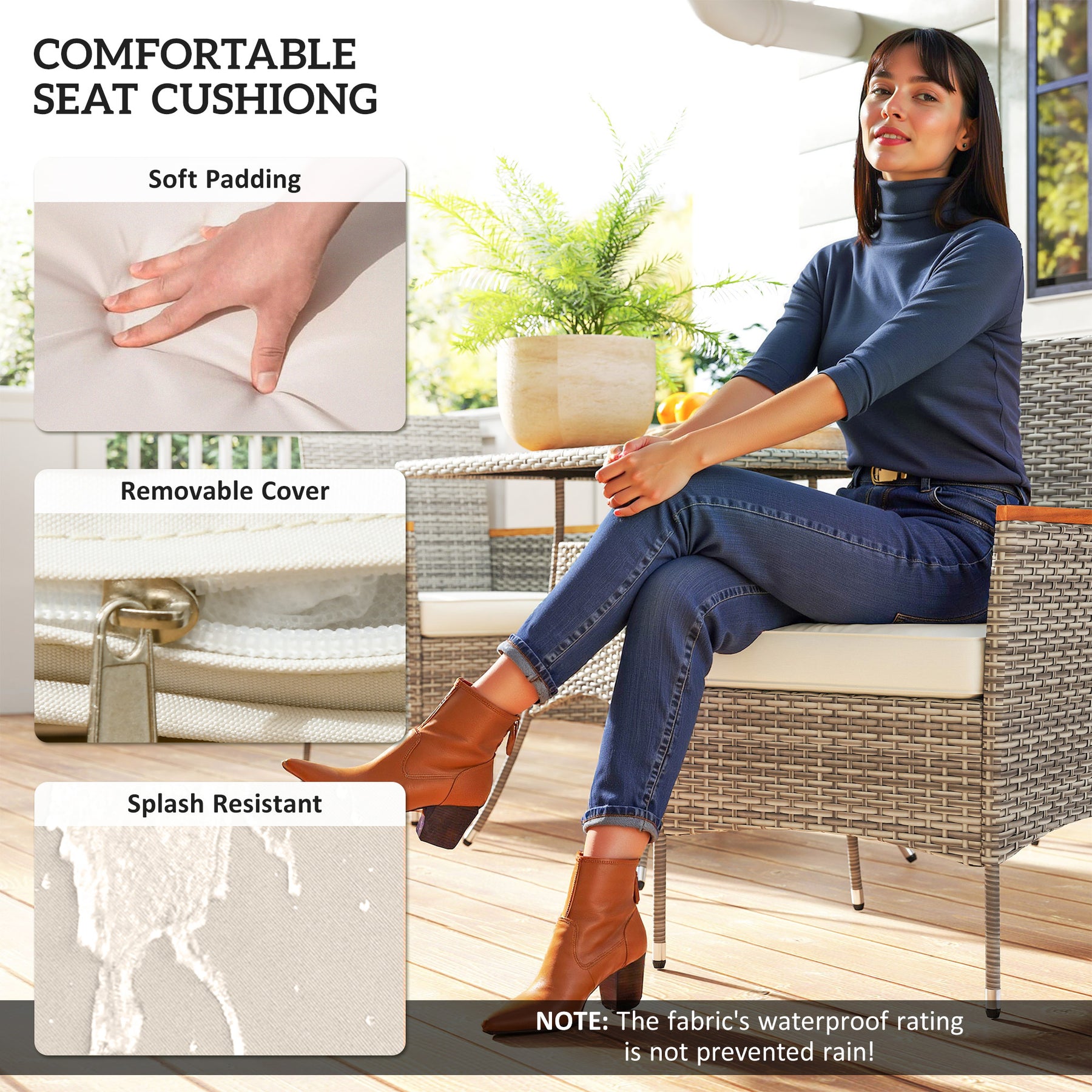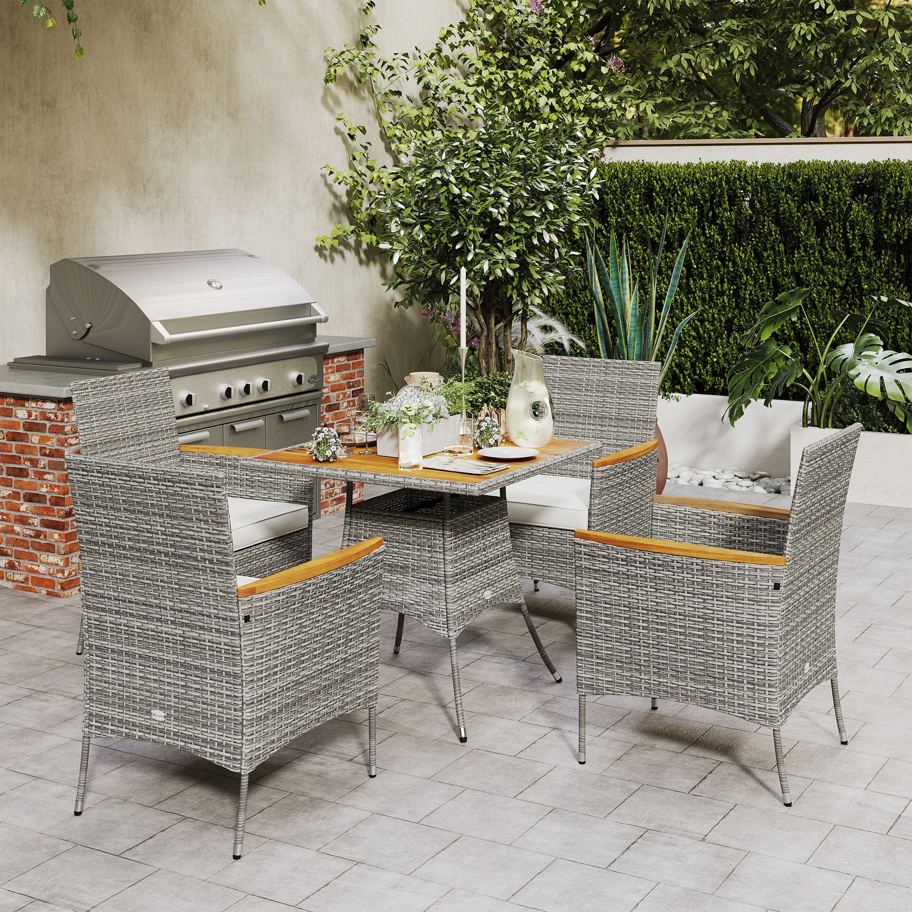Relaxing outdoor times with protection: look to this rattan outdoor dining set. It's formed of four chairs and a square table to gather around with company.; the table features a Ф50mm middle hole for a parasol umbrella, with beautiful acacia wood panels. With steel frames for a strong core, the patio table and chairs are wrapped in stylish and protective plastic wicker. Complete with padded seat cushions for comfort.