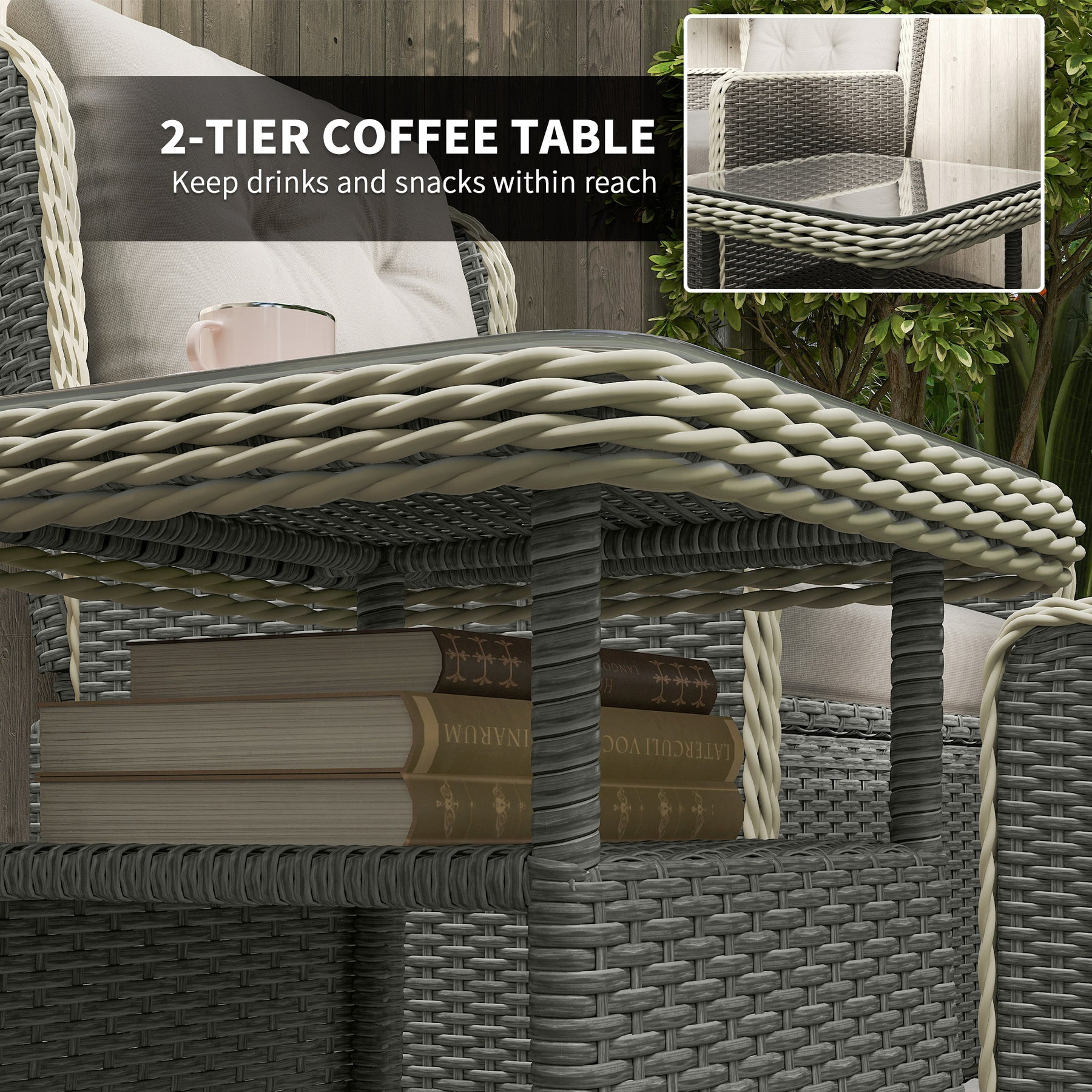 This outdoor furniture set comes with two reclining chairs, two footstools and a two-tier coffee table. The footstools with slight sloped top are designed for ergonomic leg support. Set the chair backs to a maximum 150° angle - lie back to the position you want, with the padded cushions providing plenty of comfort. The garden furniture set is complete with a tempered glass tabletop on the two-tier table.