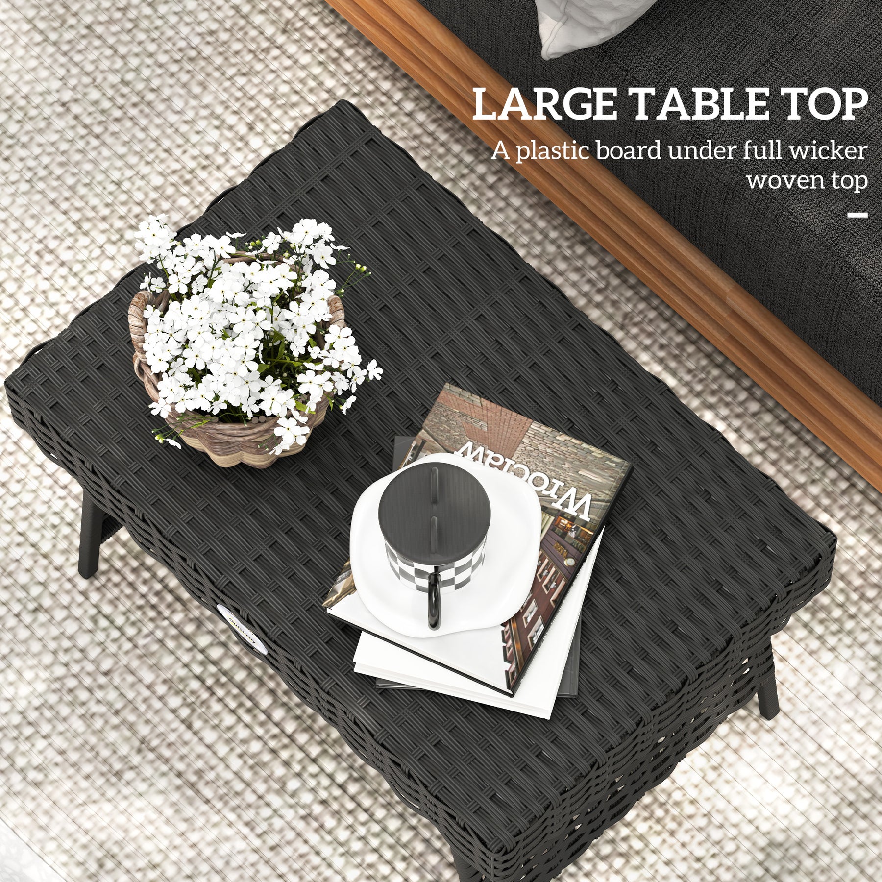 - Outdoor coffee table has oblong tabletop: plenty of holding room