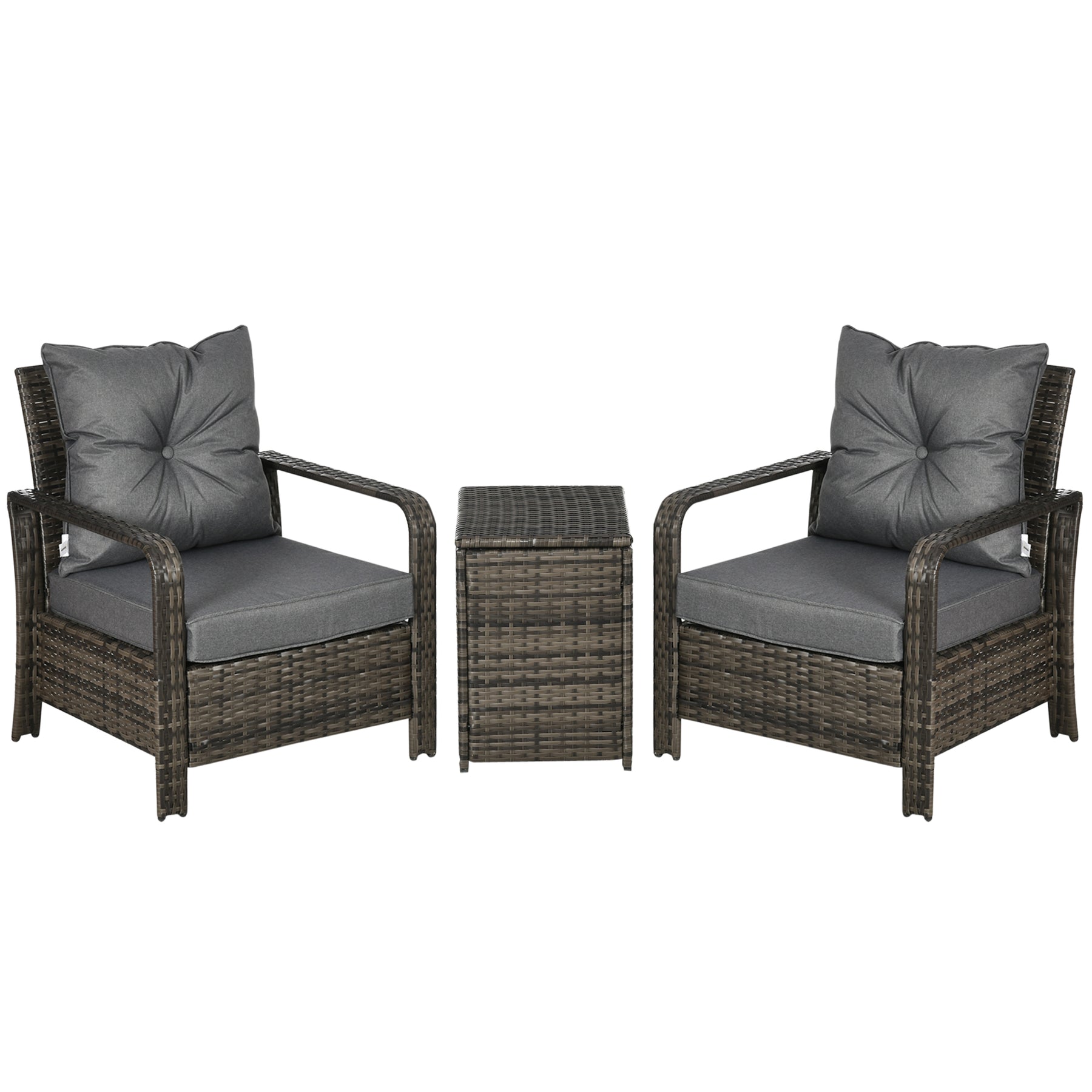 MCL 3 Pieces Rattan Bistro Set, Wicker Garden Furniture Set with Storage Coffee Table and Chairs, Thickened Cushions for Outdoor, Patio, Balcony, Grey