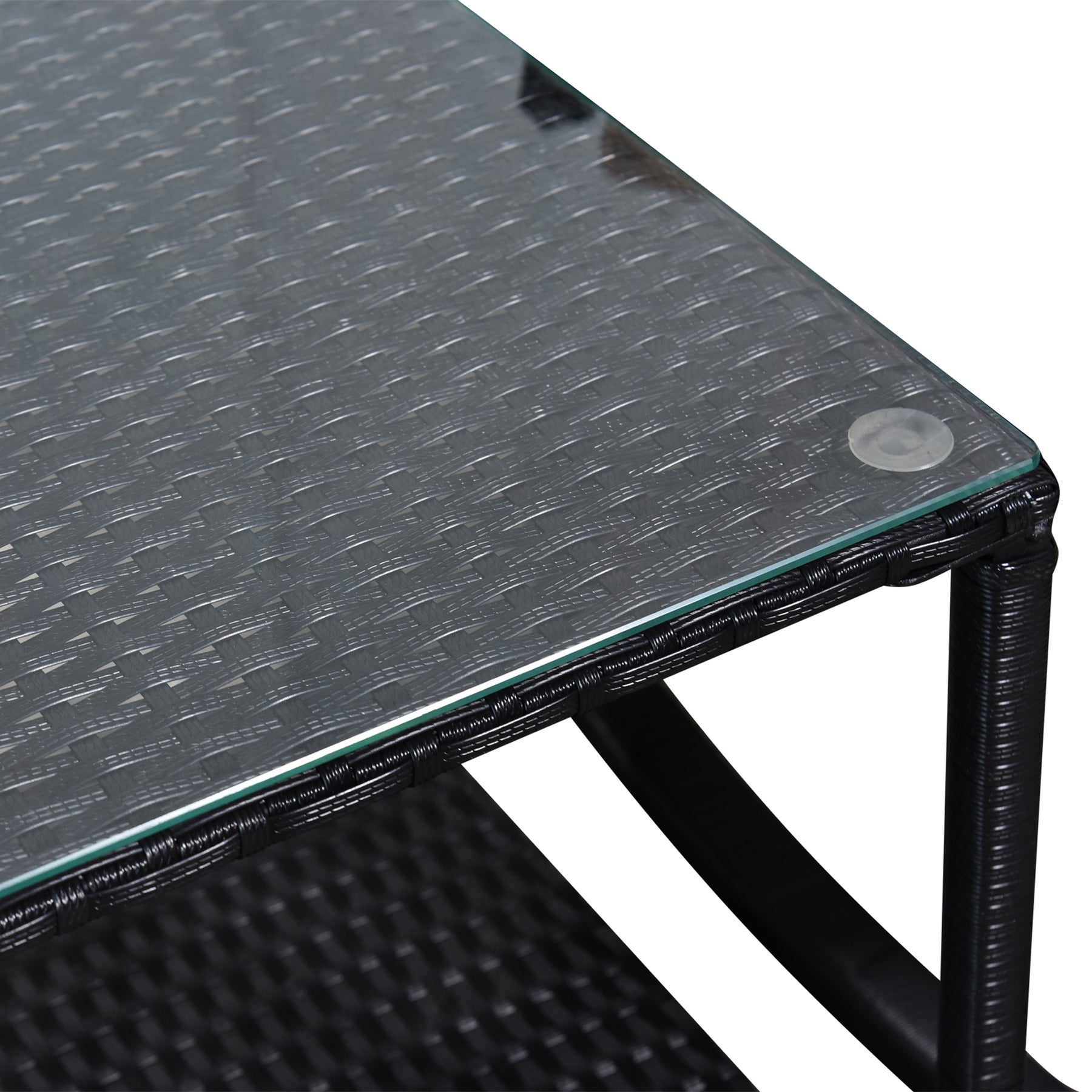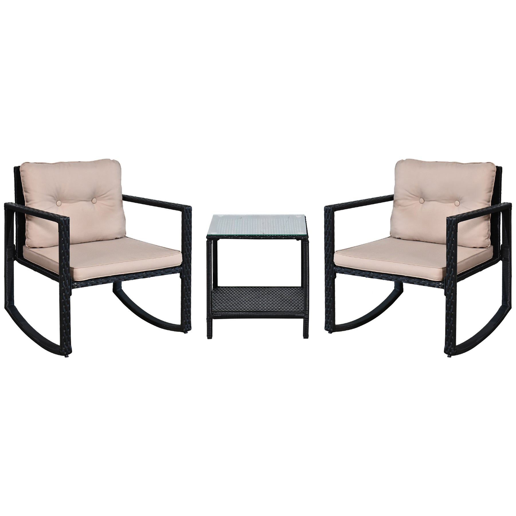 MCL 3 Pieces Rattan Garden Rocking Chair Set, Outdoor Rocking Bistro Set w/ 2 Cushioned Armchair and Glass Top Two-tier Coffee Table, Black