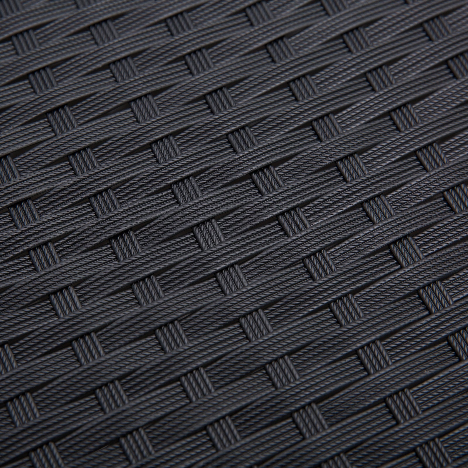 • includes two wide chairs, a two-seat sofa and large coffee table • Matte black metal frame with PE rattan panels, a muted and stripped back look