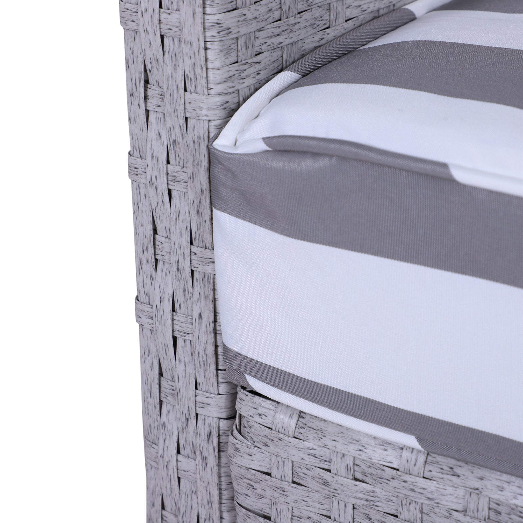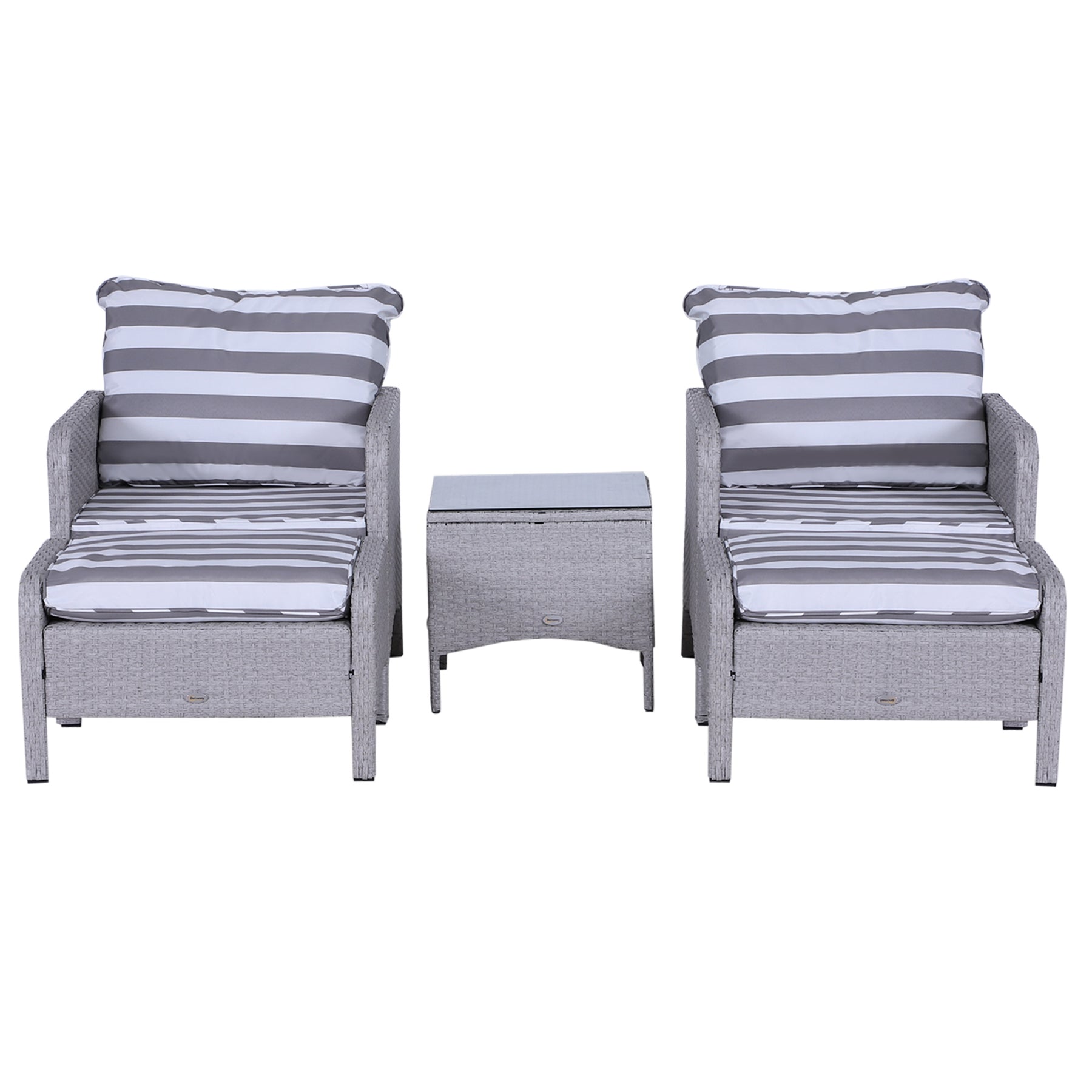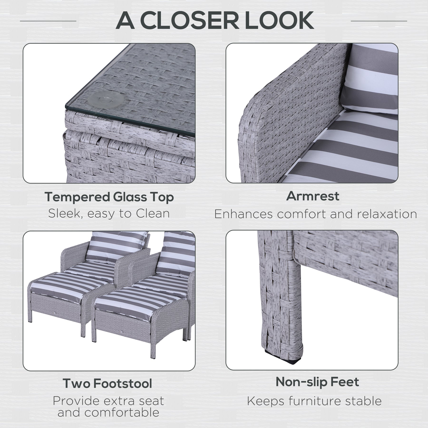 MCL 5 Pieces PE Rattan Garden Furniture Set with 10cm Thick Padded Cushions, Wicker Weave Outdoor Seating Chairs with 2 Armchairs, 2 Stools, Glass Top Table, Grey and White