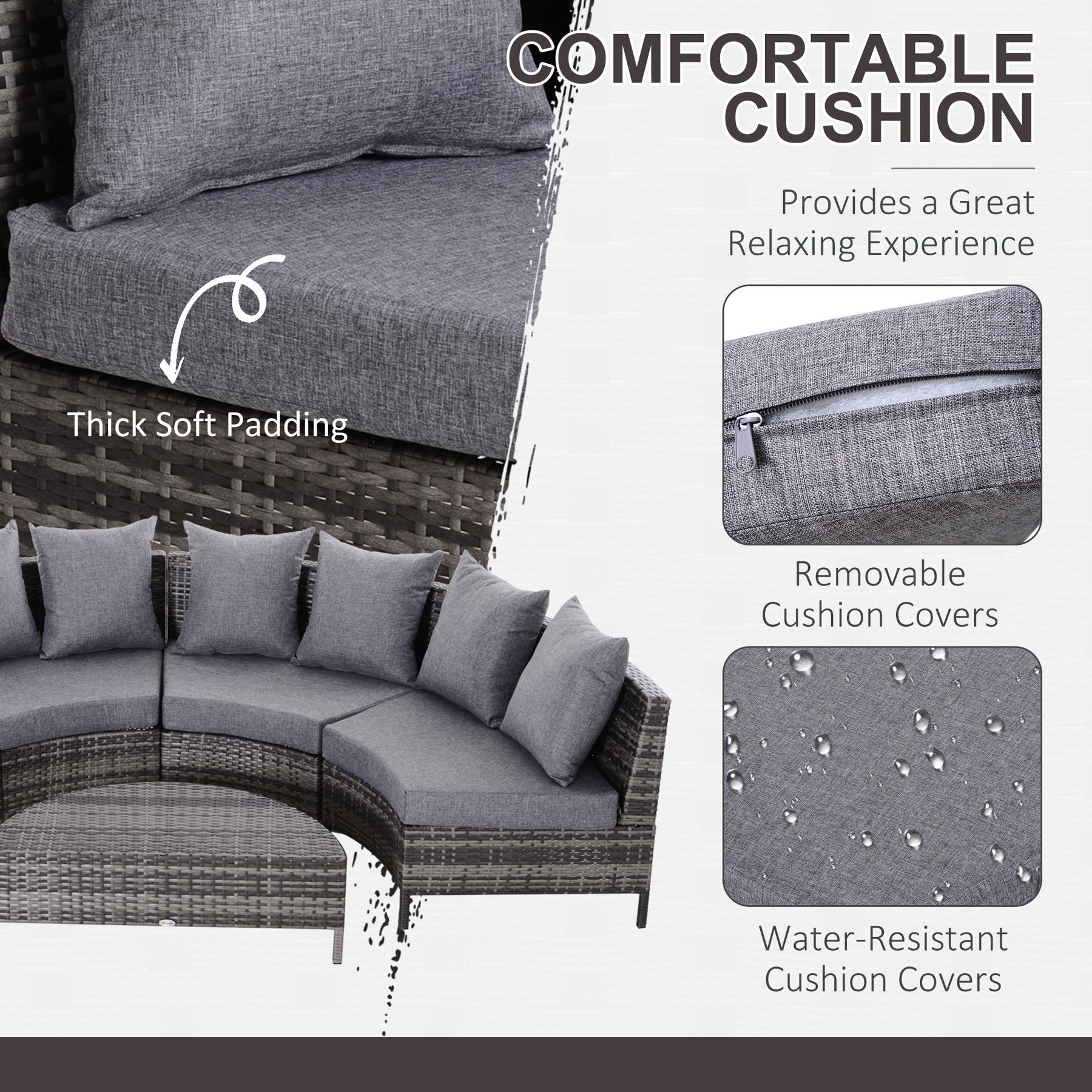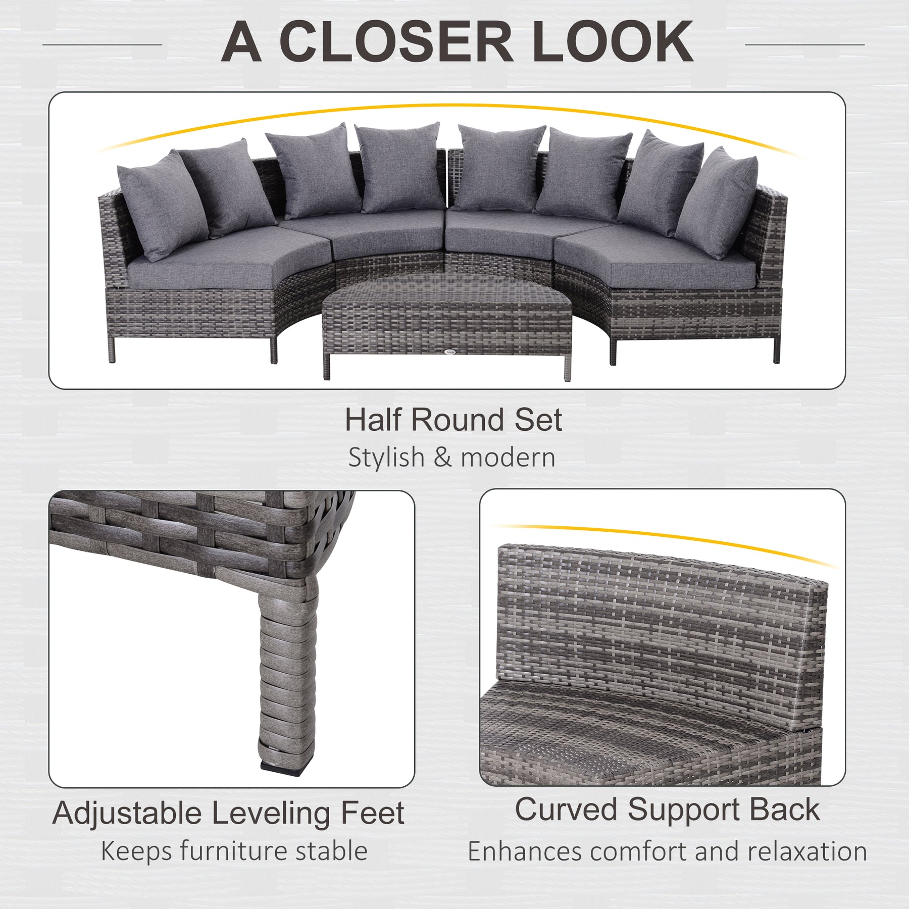 MCL 5 Pieces Rattan Garden Furniture Set, 4 Seater Half-Round Garden Sofa Set with Thickened Cushions, Wicker Conservatory Furniture with 4 Chairs, Rattan Coffee Table and Pillows, Grey