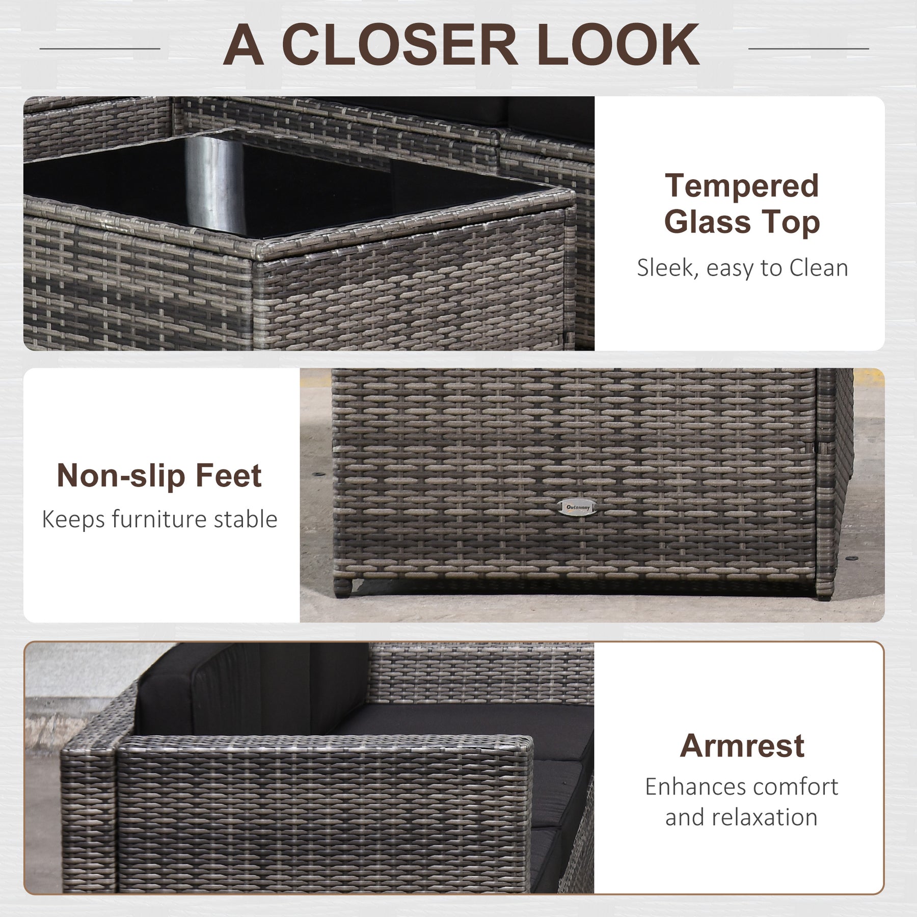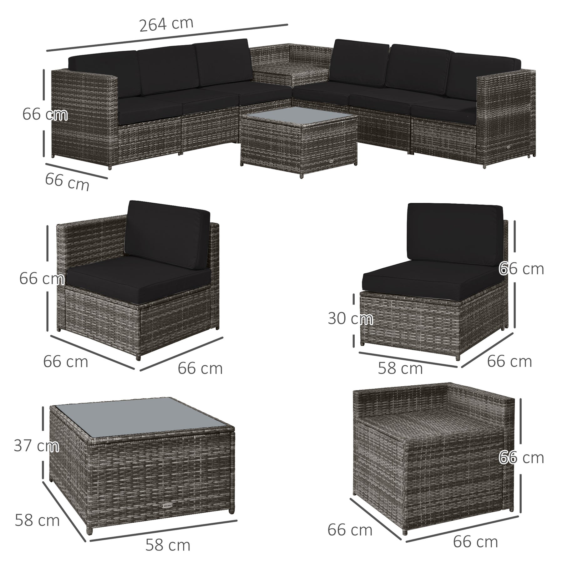 • Features:-Stylish outdoor rattan sofa set consisting of four seats, two corner seats, a corner table and a coffee table with a sleek tempered glass top