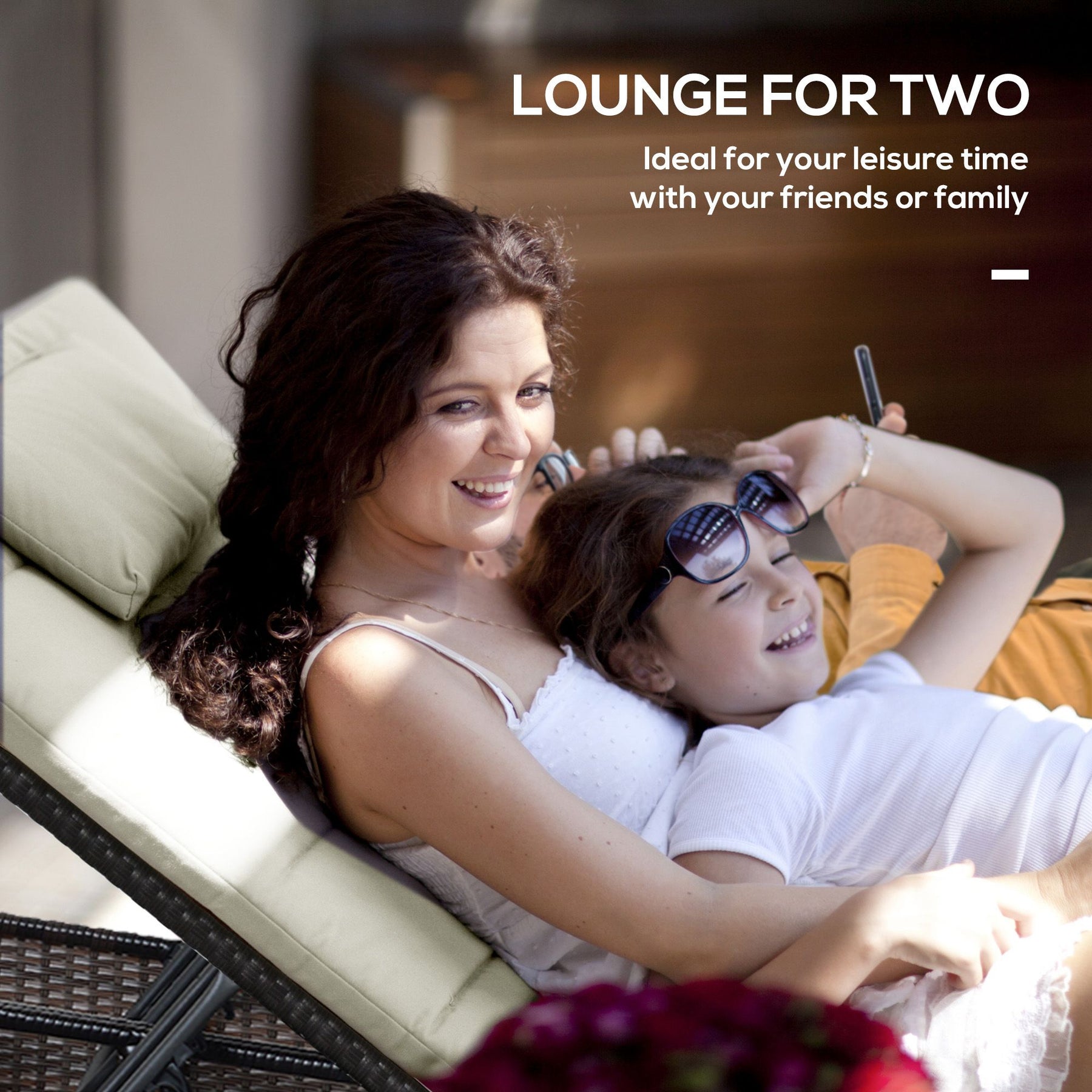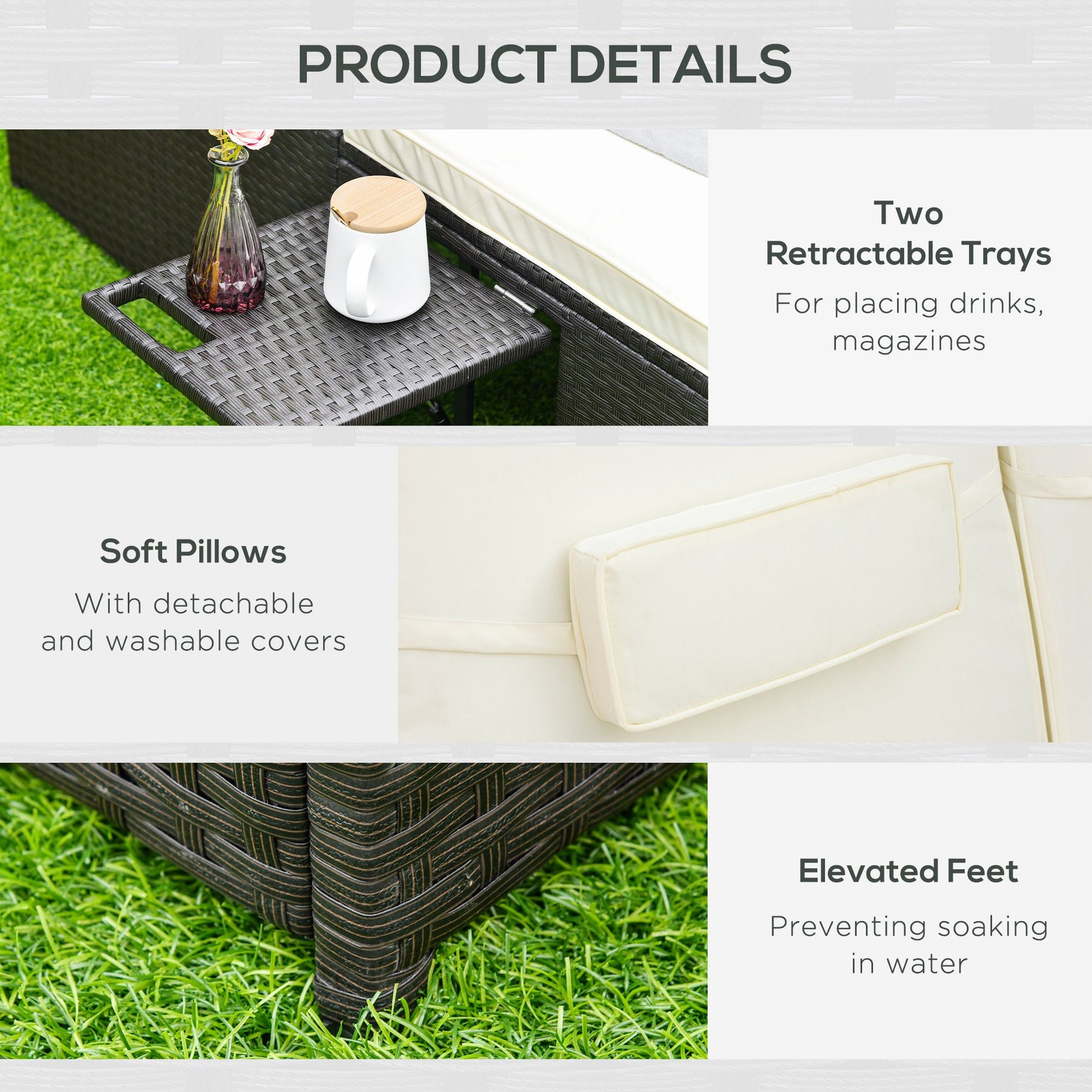 MCL Double Rattan Sun Lounger, Garden Daybed with 5-Level Adjustable Backrest and Flip Side Trays, Wicker Outdoor Furniture Recliner with Cushions and Pillows for Patio, Cream White