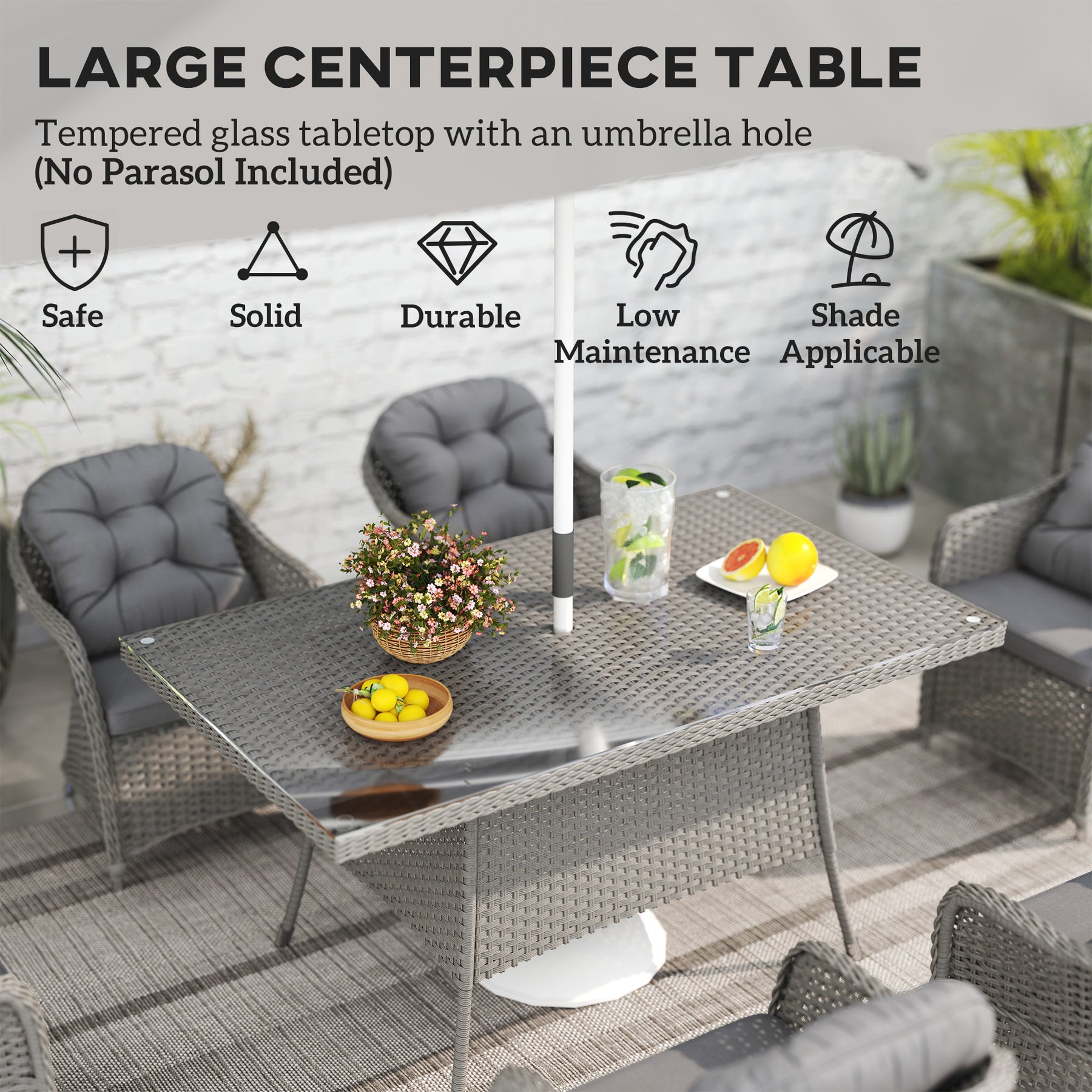 Bring everyone together outside, this season and beyond, with this rattan garden furniture set. Includes six chairs and a large table - plenty of space for your favourite company. Each piece is made from powder coated aluminium for a strong core, wrapped in durable and stylish plastic wicker - a protective rattan shell. Keep safely shaded, thanks to the parasol hole in the glass-top table.