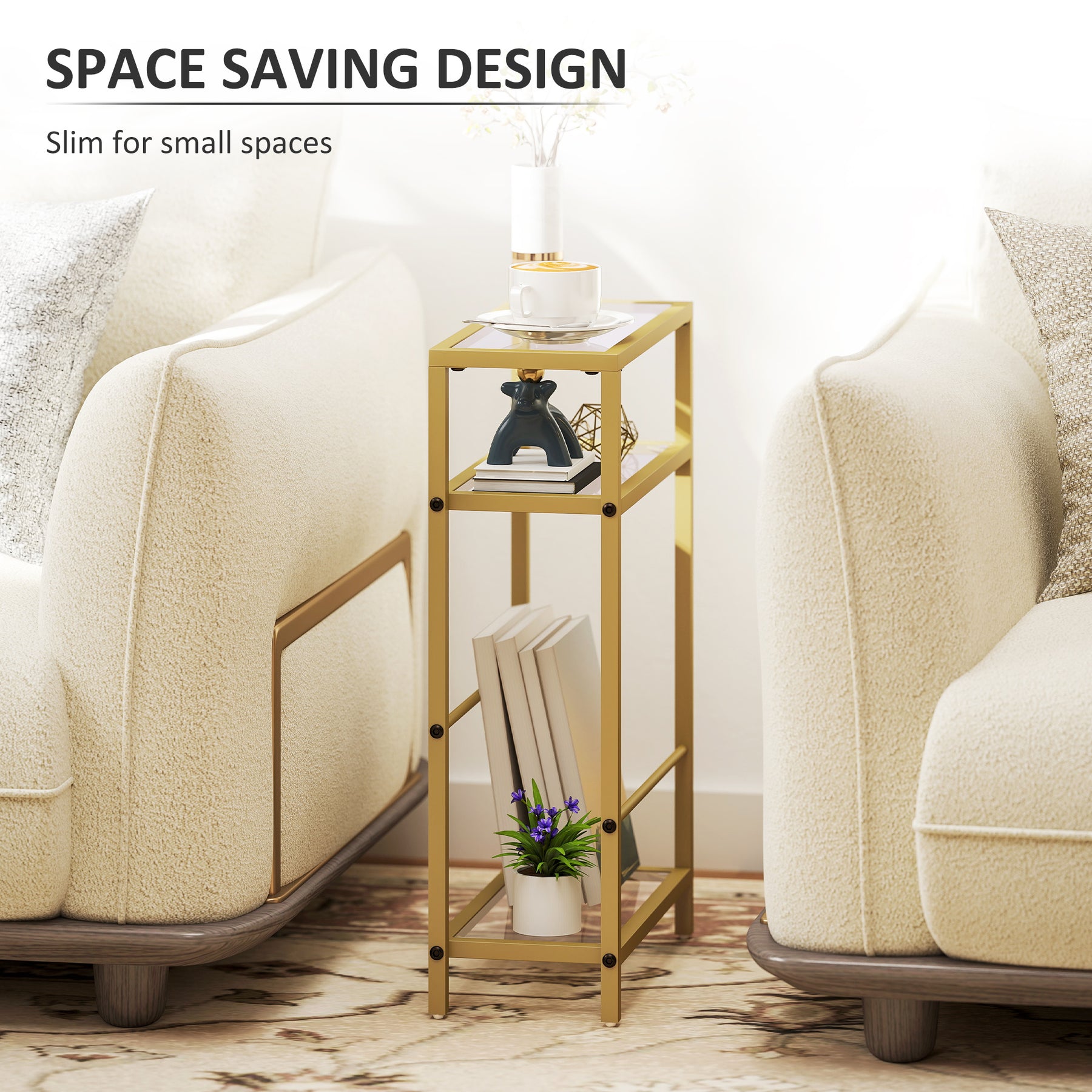 Discover the chic versatility of the three-tier shelf, featuring sleek tempered glass levels optimal for any snug space. Its 18 cm width makes it a great slim end table or living room side table. The quirky misaligned bottom crossbars add a touch of fun while keeping your books tidy. All wrapped up in a stylish powder-coated steel frame!