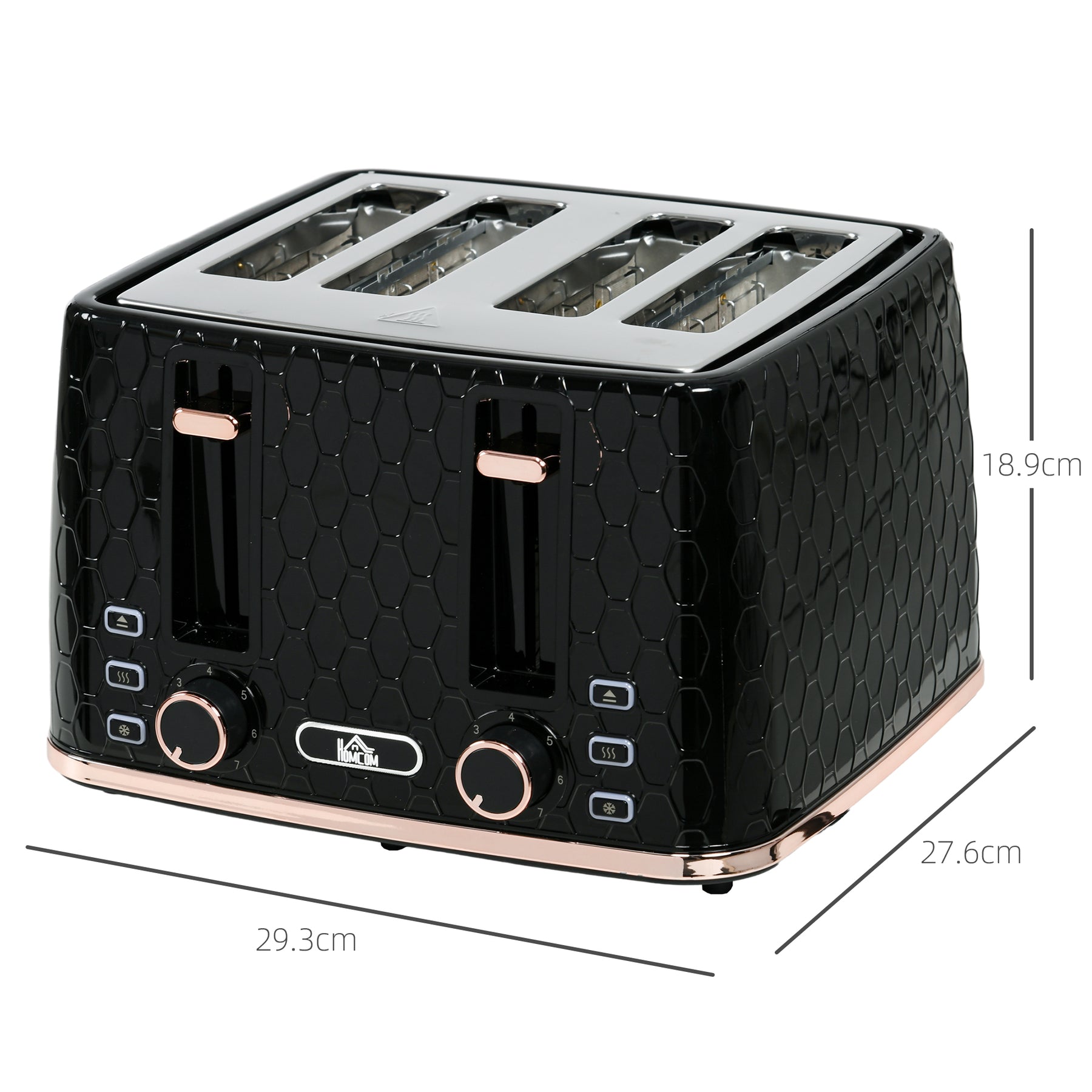 Wake up to delicious toast, in modern style - thanks to this four slice toaster. It comes in a honeycomb textured design - this is a piece you'll love having as part of your countertop. Seven toasting levels means you can have your toast as brown and crispy as you want, with automatic centring for an even result every time. The automatic shut-off means no stuck, and burnt toast, complete with a removable comb tray for easy cleaning.