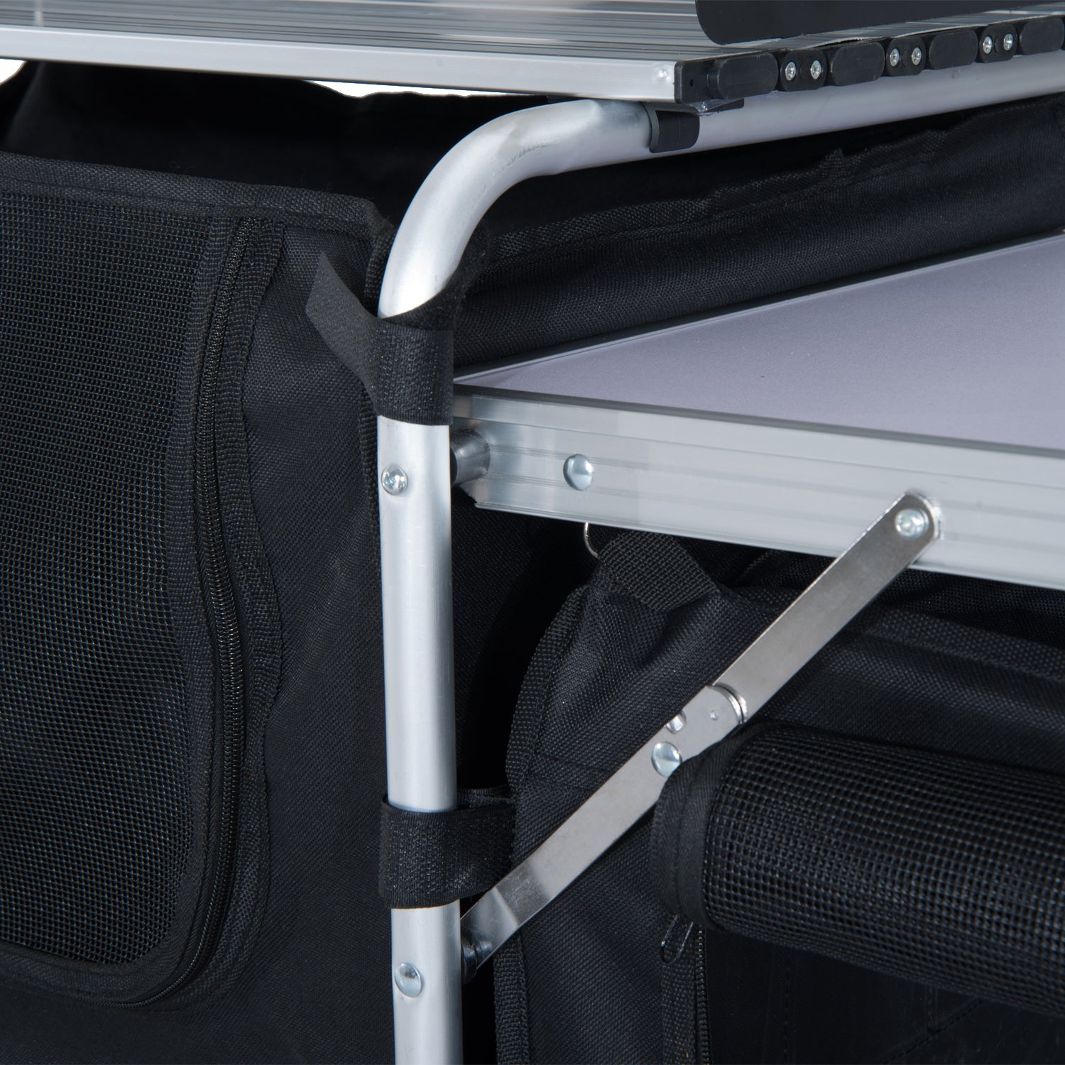 - Formed of three aluminium tabletops and three cupboards. Zipped doors on cupboards roll up and stay in place