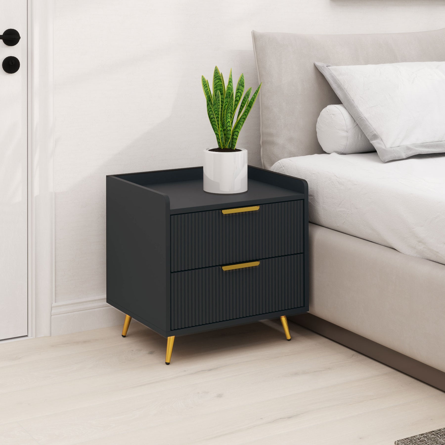 A bedroom essential, in bold and elegant style with this nightstand. The ridged drawer fronts and gold tone handles add a beautiful touch to the solid colour. With two drawers and a flat tabletop, with safe low-rise walls, there's lots of storage for bedtime essentials and more. Complete with a metal legs for strong support.