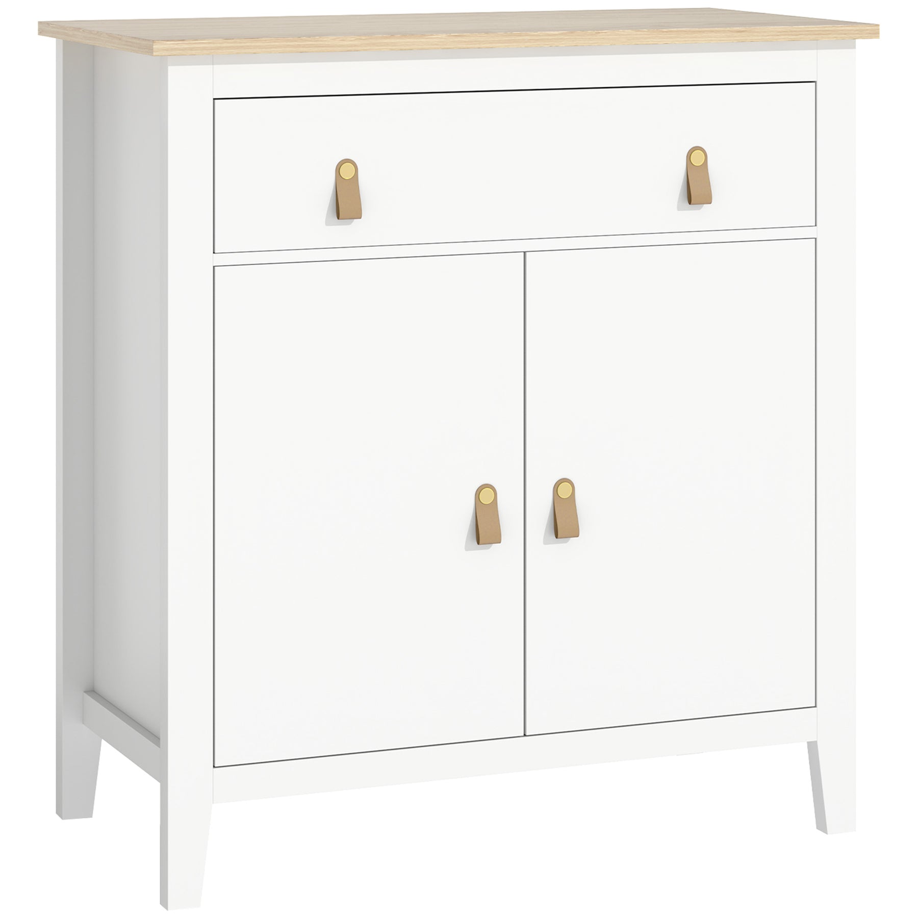 Easy home style with this sideboard. It comes in a farmhouse style design: a coloured body, with a wood-effect top - plus faux leather handles for a little point of difference, great as a kitchen storage cabinet or living room sideboard. It offers plenty of space too: a drawer and a two-tier cupboard with adjustable shelving, with the flat top for extra display and holding space.