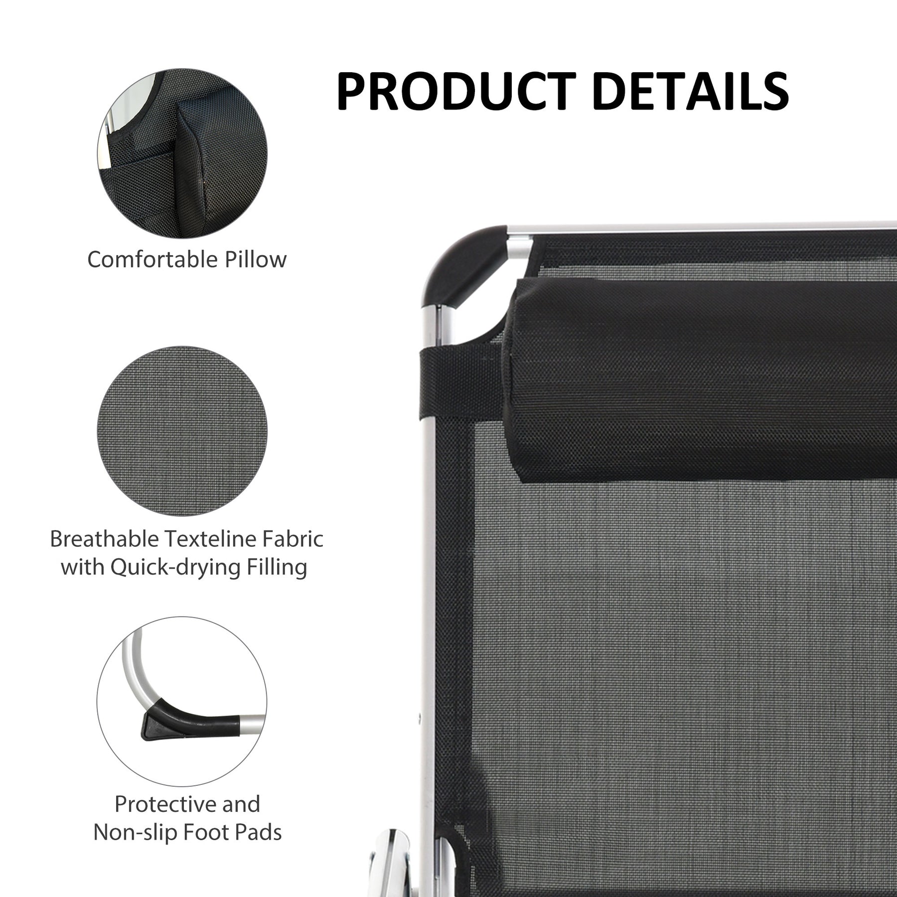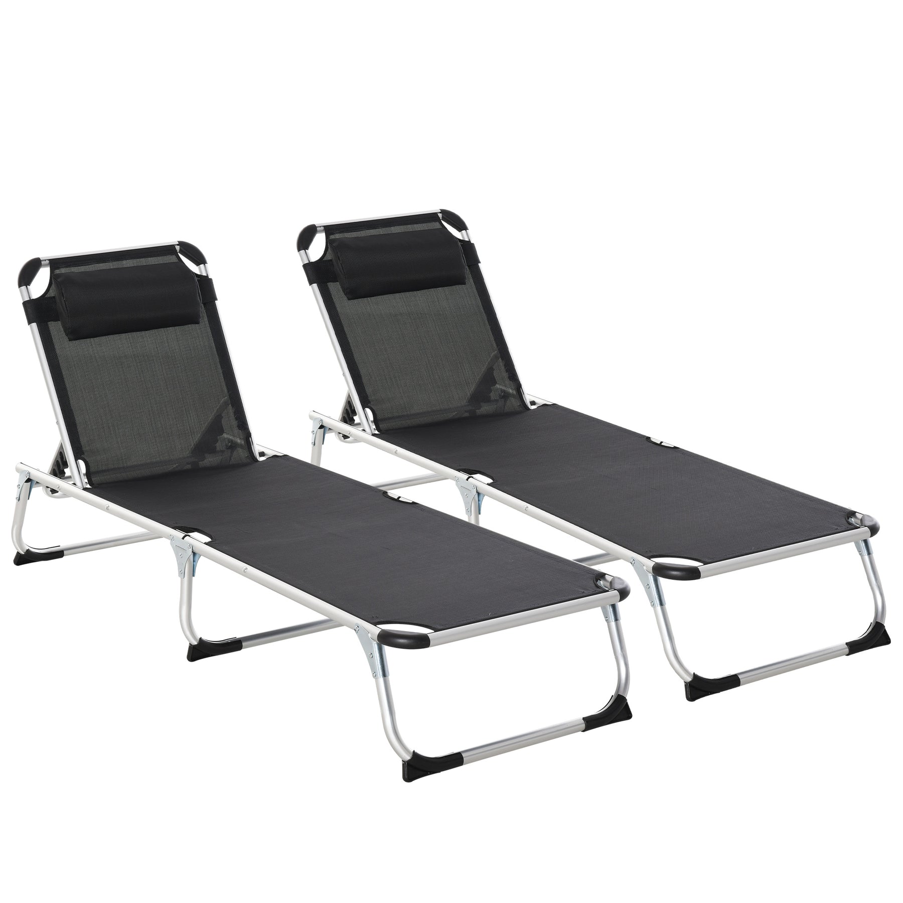Foldable Outdoor Sun Loungers Set of 2, Reclining Lounge Chair Camping Bed Cot with Pillow 4-Level Adjustable Back Aluminium Frame, Black