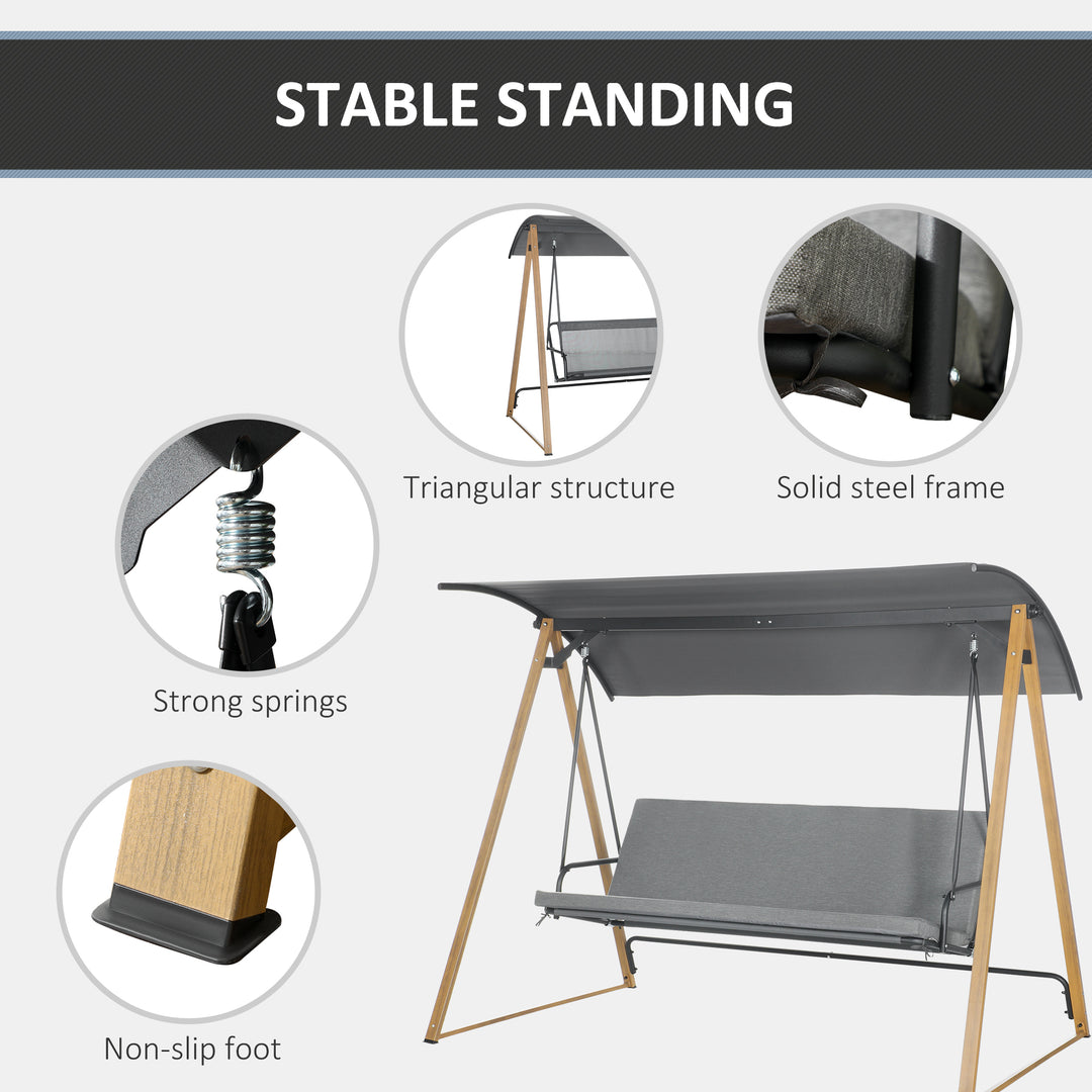 Rest outdoors with swinging garden chair. Seat holds up to three people - plenty of room to sit with the company or grab lots of room to yourself. The adjustable 30° angle canopy shields you from sun glare and light weather. The swinging chair's steel frame means a strong structure, with non-slip foot pads to complete.