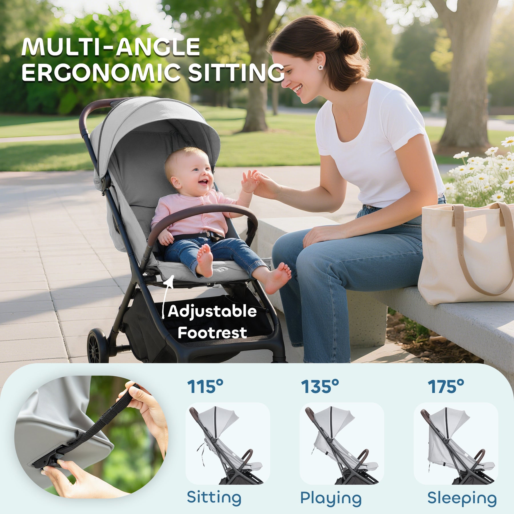 Juggling errands with a little baby can be overwhelming. The AIYAPLAY lightweight travel stroller simplifies your day with effortless single-hand folding, freeing your hands for life's demands. Equipped with a five-point harness, this baby pushchair protects your child's safety, offering peace of mind. Adjustable backrest and footrest adapt to your growing baby, delivering comfort through every journey.