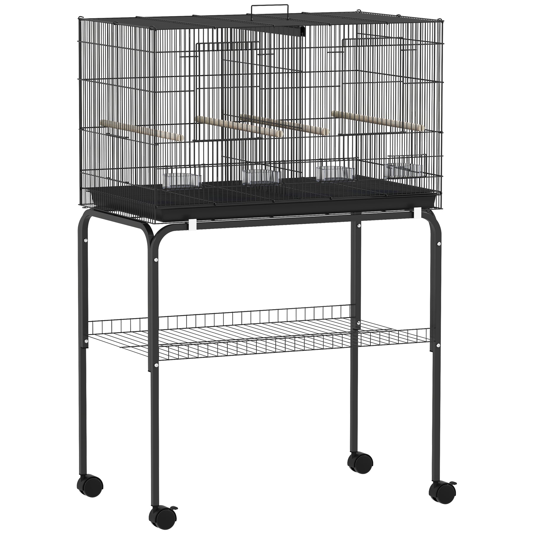 Discover the joy of a spacious budgie cage that effortlessly separates into two cosy rooms or transforms into a grand space. A secure latch on 1.2cm bar spacing, your budgies, lovebirds, or canaries will stay safe and content. Suitable for both play and relaxation, this canary cage includes 4 perches, 4 food dishes and a stand with wheels and a shelf, making it a sanctuary for your feathered friends.