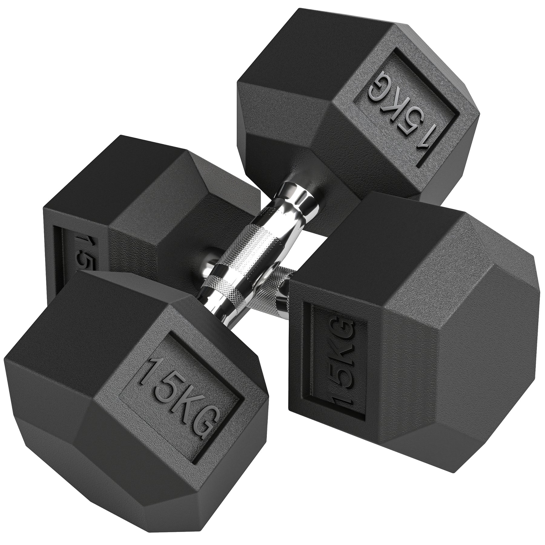 Strengthen your muscles in the most effective and easiest ways - go for this dumbbell set from HOMCOM. The 30kg weight is suitable for those accustomed to the heaviness only and can be used almost anywhere in the home and outdoors thanks to the small size. The frame is steel for a strong core and features knurl indents for grip. Both ends come in a weighted, hexagonal shape, so it doesn't roll away. The weight number is carved into the protective rubber cap for you to know which to use.