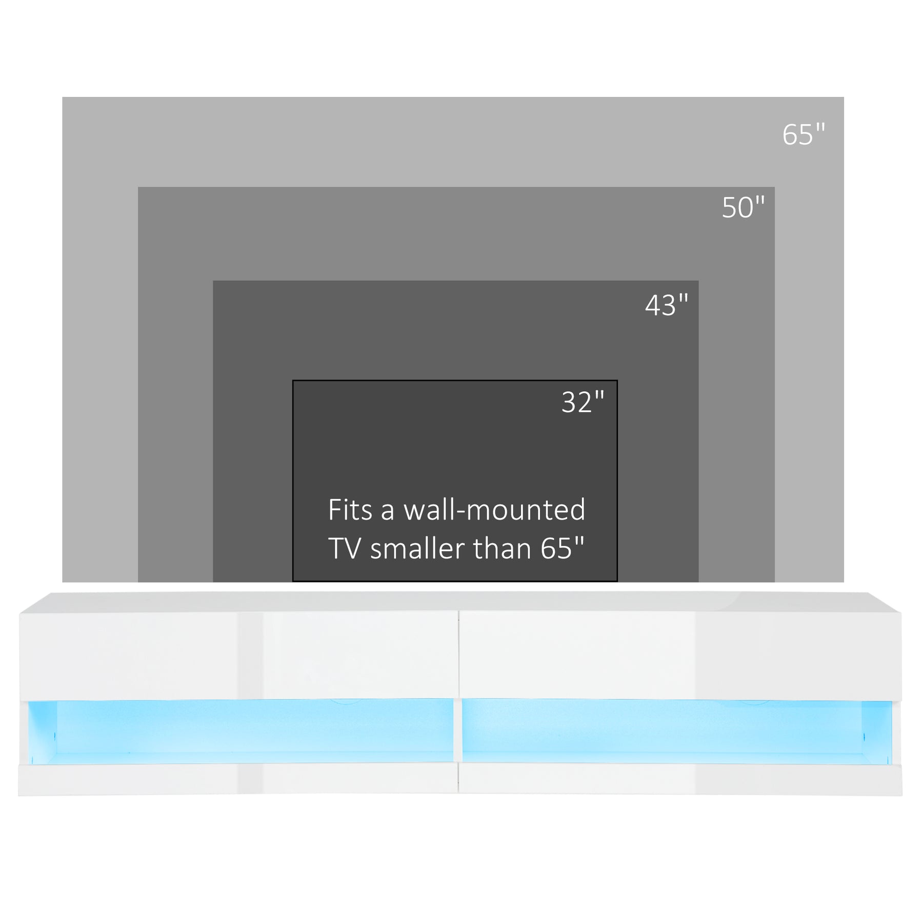 Bright, modern and cool: this floating TV cabinet brings high-gloss style into your living space. It also comes with LED lights: pick between the 16 different colours, four modes and change the brightness to create a mood you want. Features two shelves for handy storage, with half doors so you can still control media consoles without having to lift them up. A floating design - saves space and looks cool! Complete with cable holes to organise wires neatly.