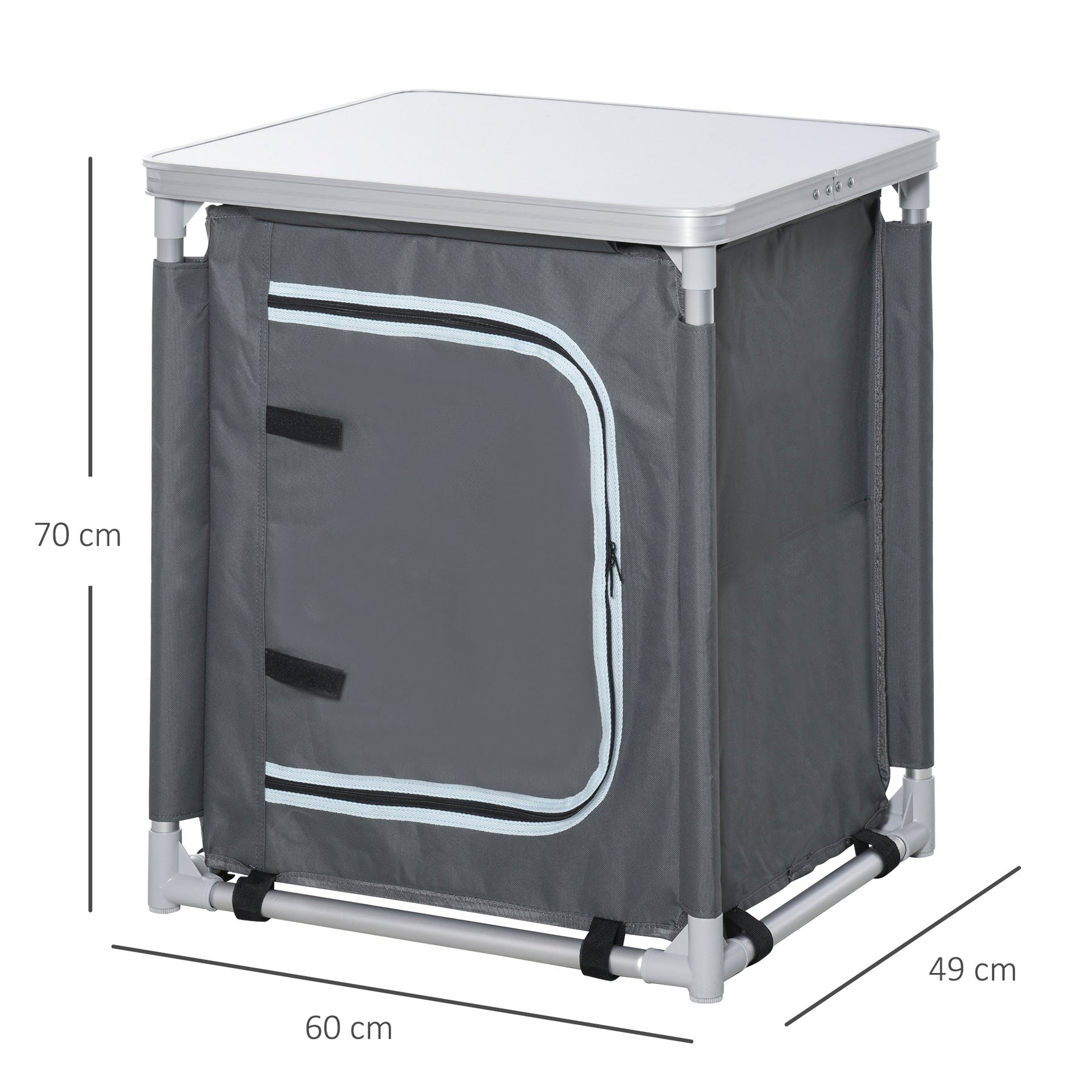 Ready when you are, this camping kitchen unit from MCL is a must for your camping trips, outdoor gatherings and more. Made from aluminium, the camping cooking table is lightweight and tough for reliable repeated use. The fabric coat covering the frame is water-resistant and features a door to shield inside. There are two shelves for convenient storage, with the solid MDF table-top giving you a flat and reliable surface to use. Comes completed with bag for easy carrying.
