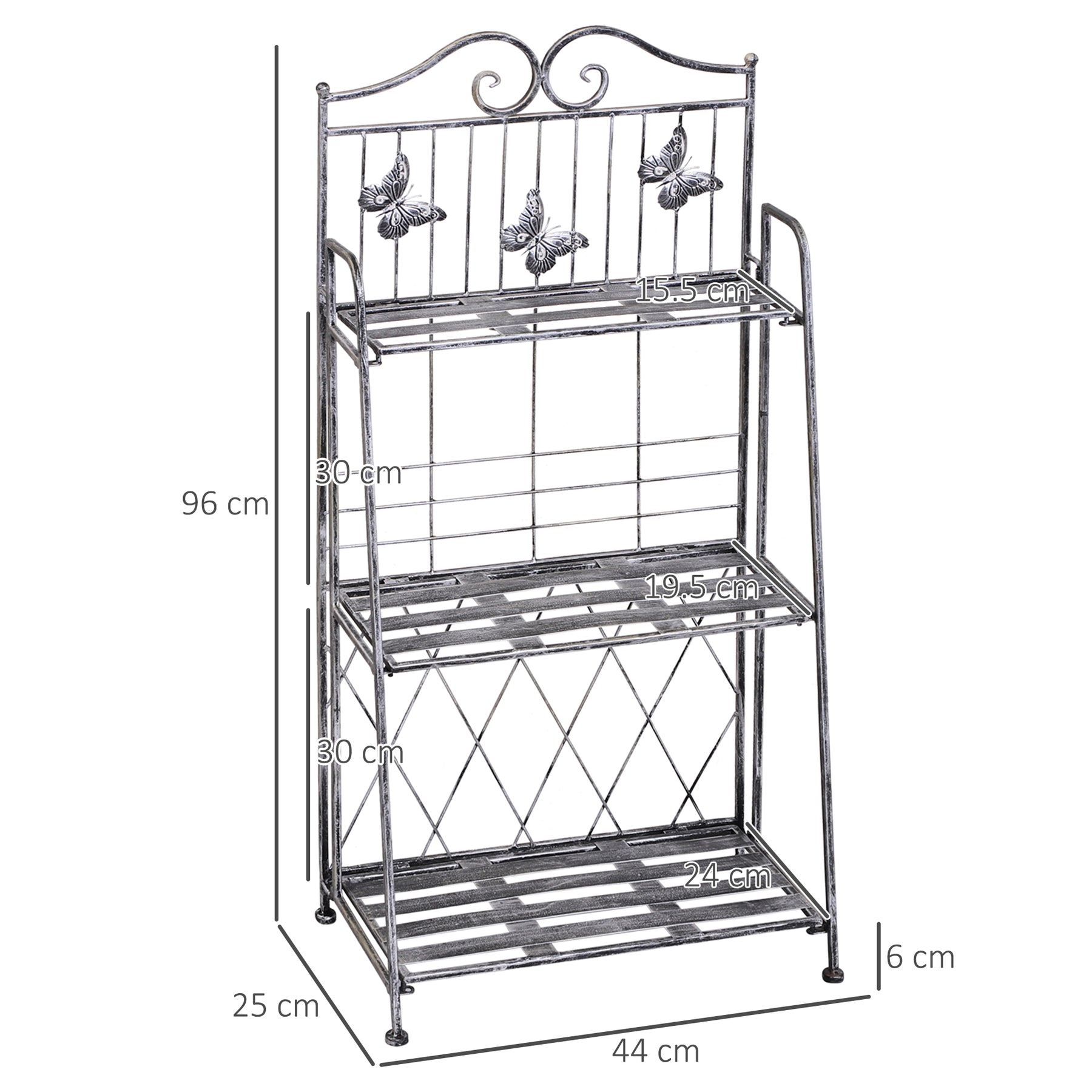 • 3-Tiered freestanding plant stand made of metal and featuring elegant scrollwork accent