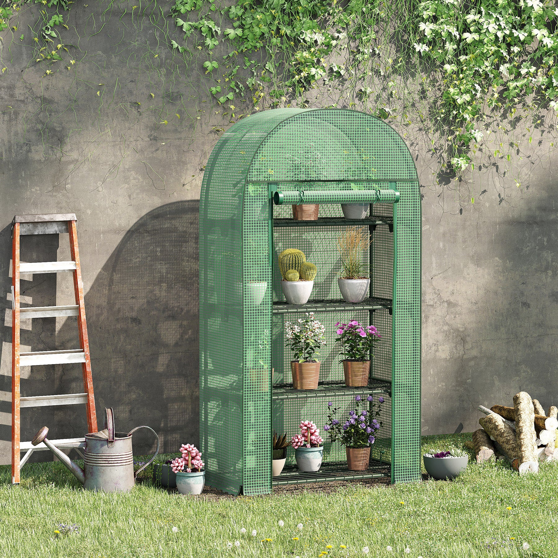 MCL 4 Tier Mini Greenhouse for Outdoor, Portable Gardening Plant Green House with Storage Shelf, Roll-Up Zipped Door, Metal Frame and PE Cover, 80 x 49 x 160cm, Green