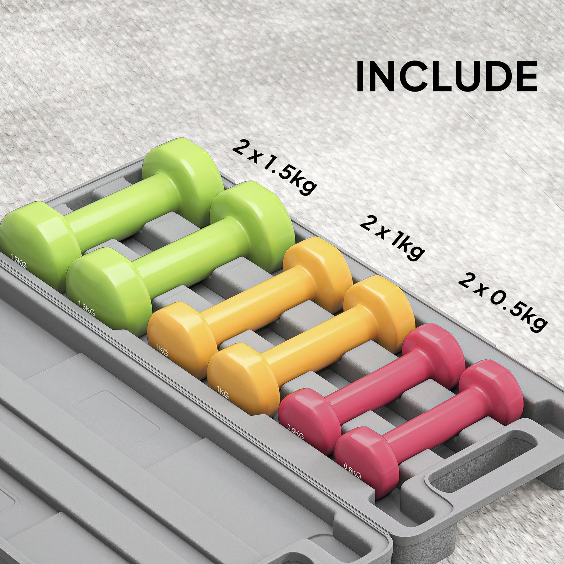 • Three pairs of colourful dumbbells, weighing 0.5kg, 1kg and 1.5kg respectively, satisfying your different training needs