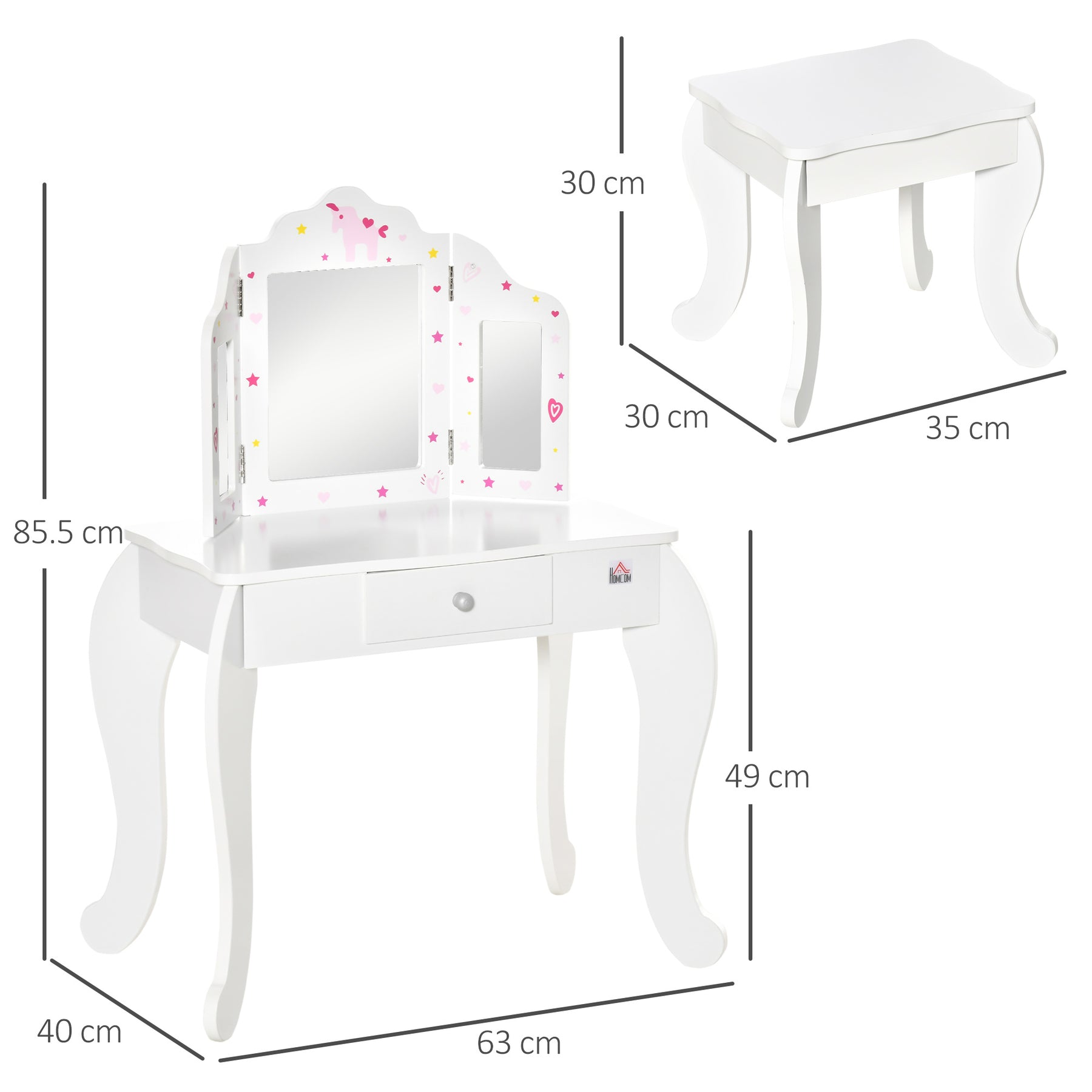 MCL Kids Vanity Table and Chair Set with Tri-Folding Mirror and Stool, Makeup Dressing Table with Drawer, White