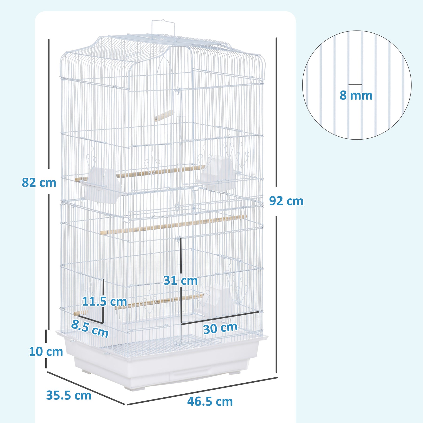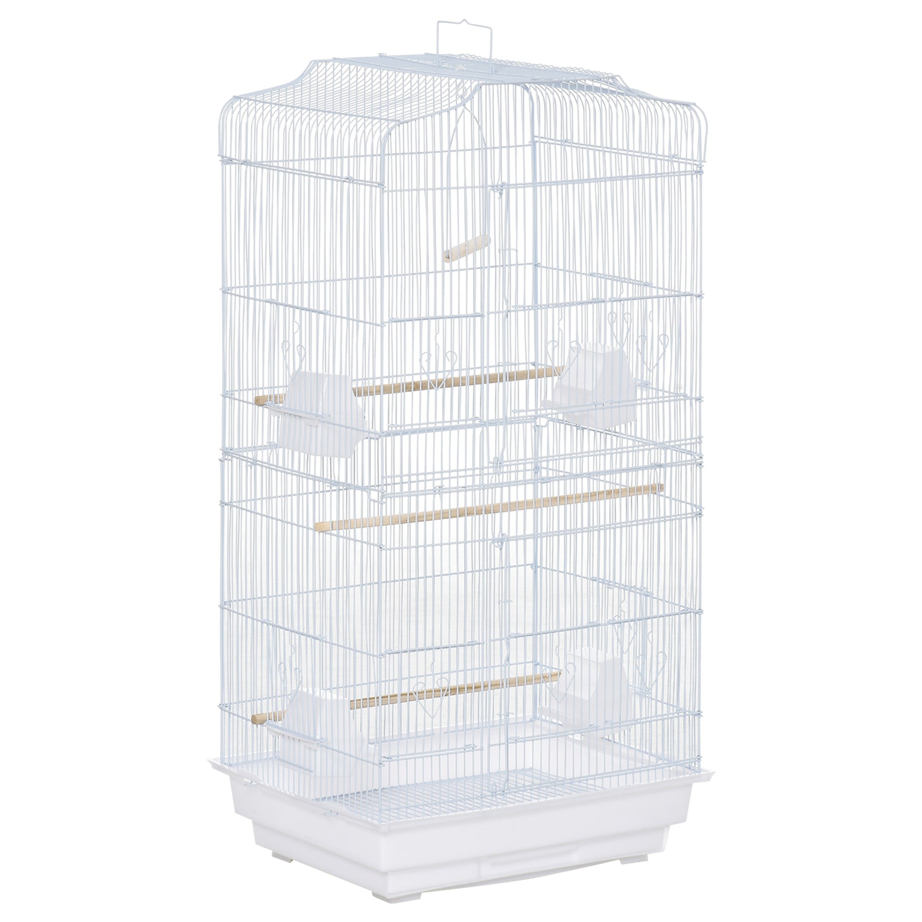 A spacious MCL bird cage, featuring three wooden perches, four plastic food containers and a swing to provide an entertaining and comfortable home for birds. Two large front doors allow easy access, while the ten small doors enable feeding, cleaning and interaction. The slide-out tray at the bottom makes it easy to clean, keeping the space tidy and comfortable for eating, playing and relaxing.