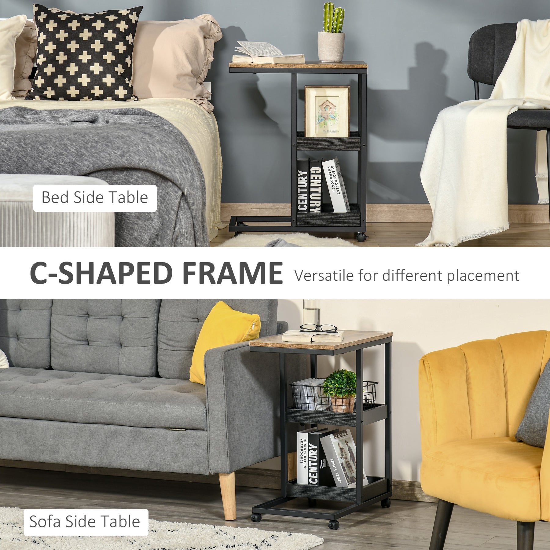 MCL Mobile Sofa Side Table, Industrial C-Shaped Rolling Table with 3-Tier Storage Shelving, Four Lockable Wheels Steel Frame, Dark Brown