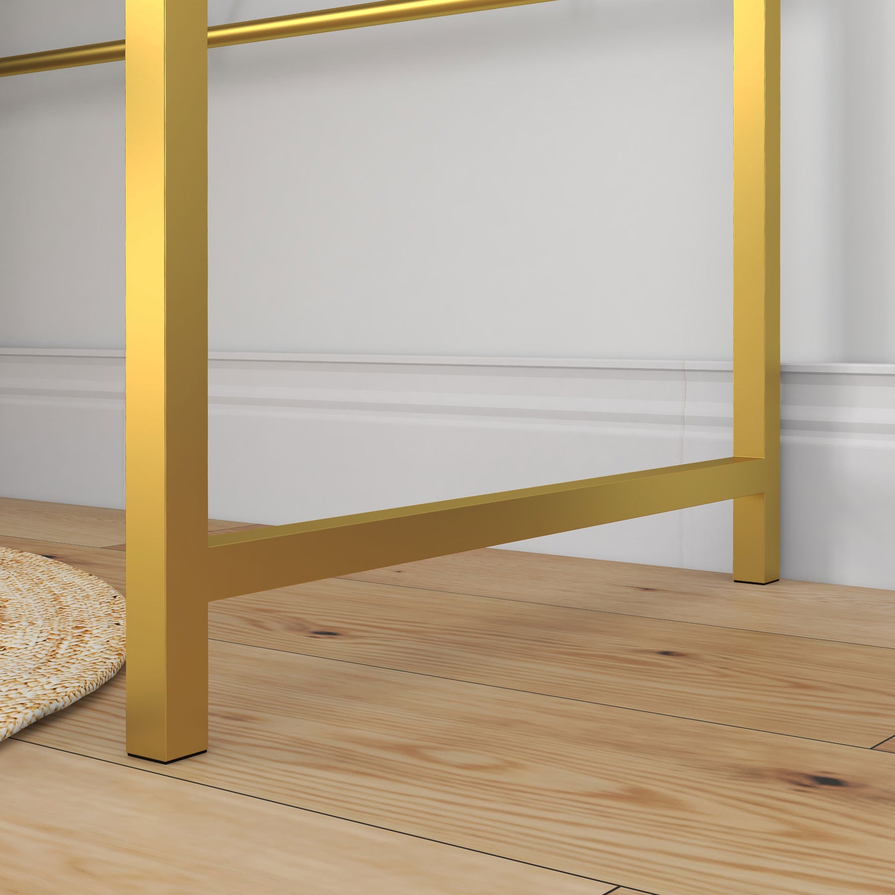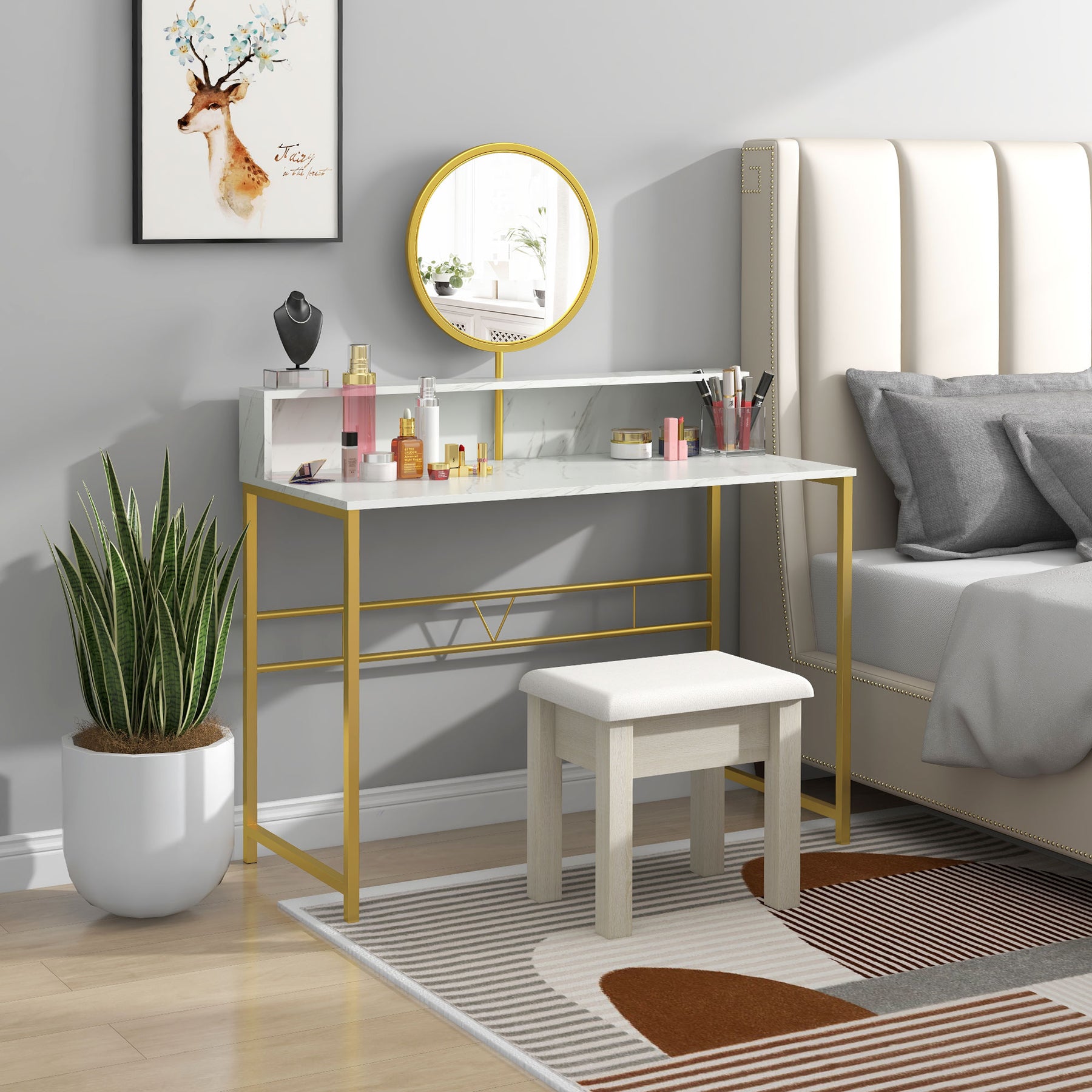 MCL Modern Dressing Table with Round Mirror, Vanity Makeup Desk with Open Storage, Faux Marble Texture and Steel Frame for Bedroom, White