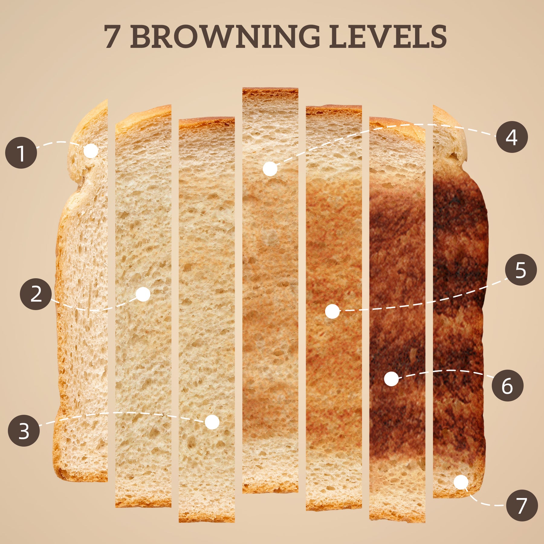 - Four-slice toast has seven browning levels. Defrost, reheat and cancel