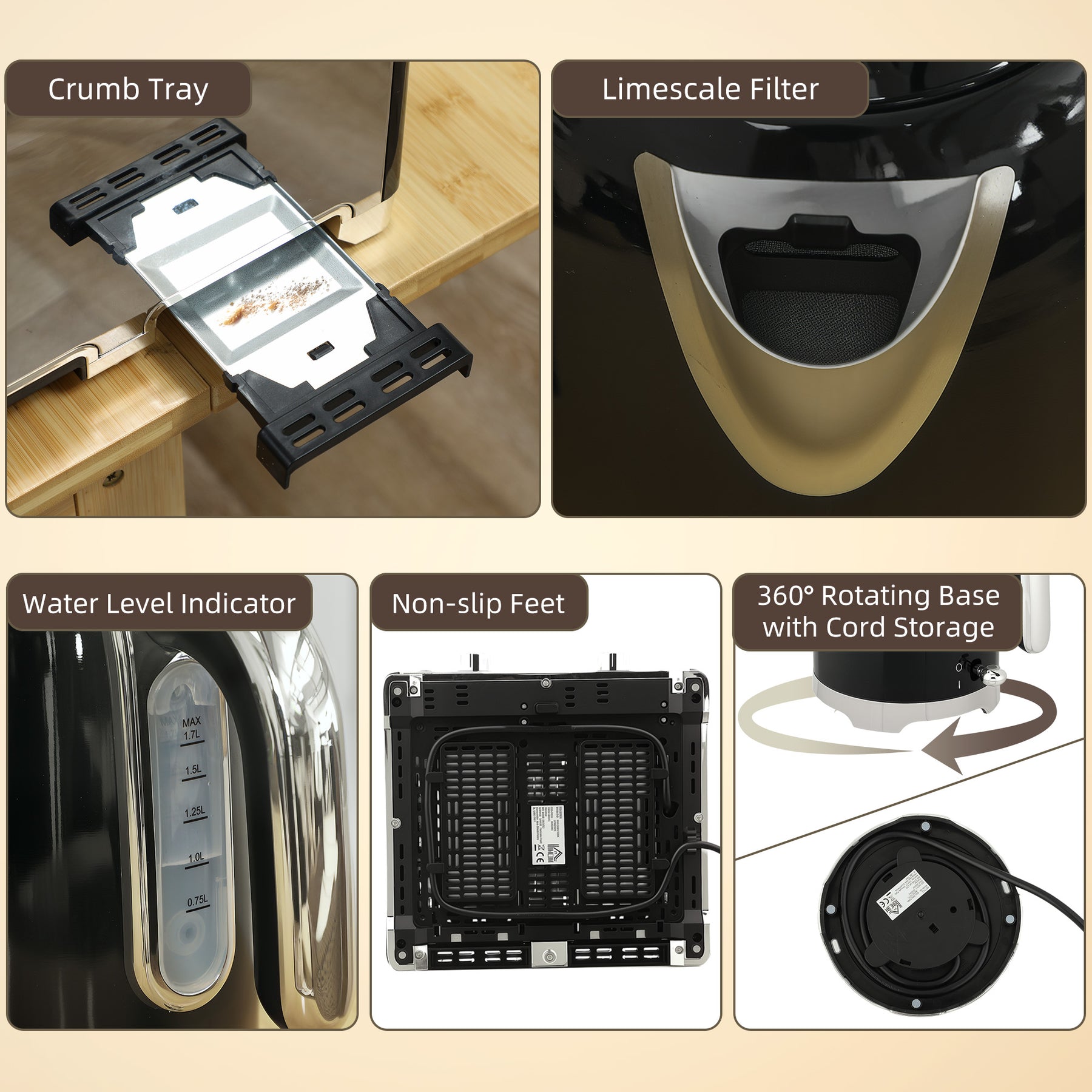 Take mornings back in time, with this MCL toaster and kettle set. The solid black colour and silver-tone accents merge with the super-curved shape for a retro look - a statement piece for countertops. The 1.7L capacity of the kettle boils enough water for seven cups, so the whole family can enjoy a hot beverage at once. The four-slice toaster has seven browning levels and defrost/reheat/cancel functions.