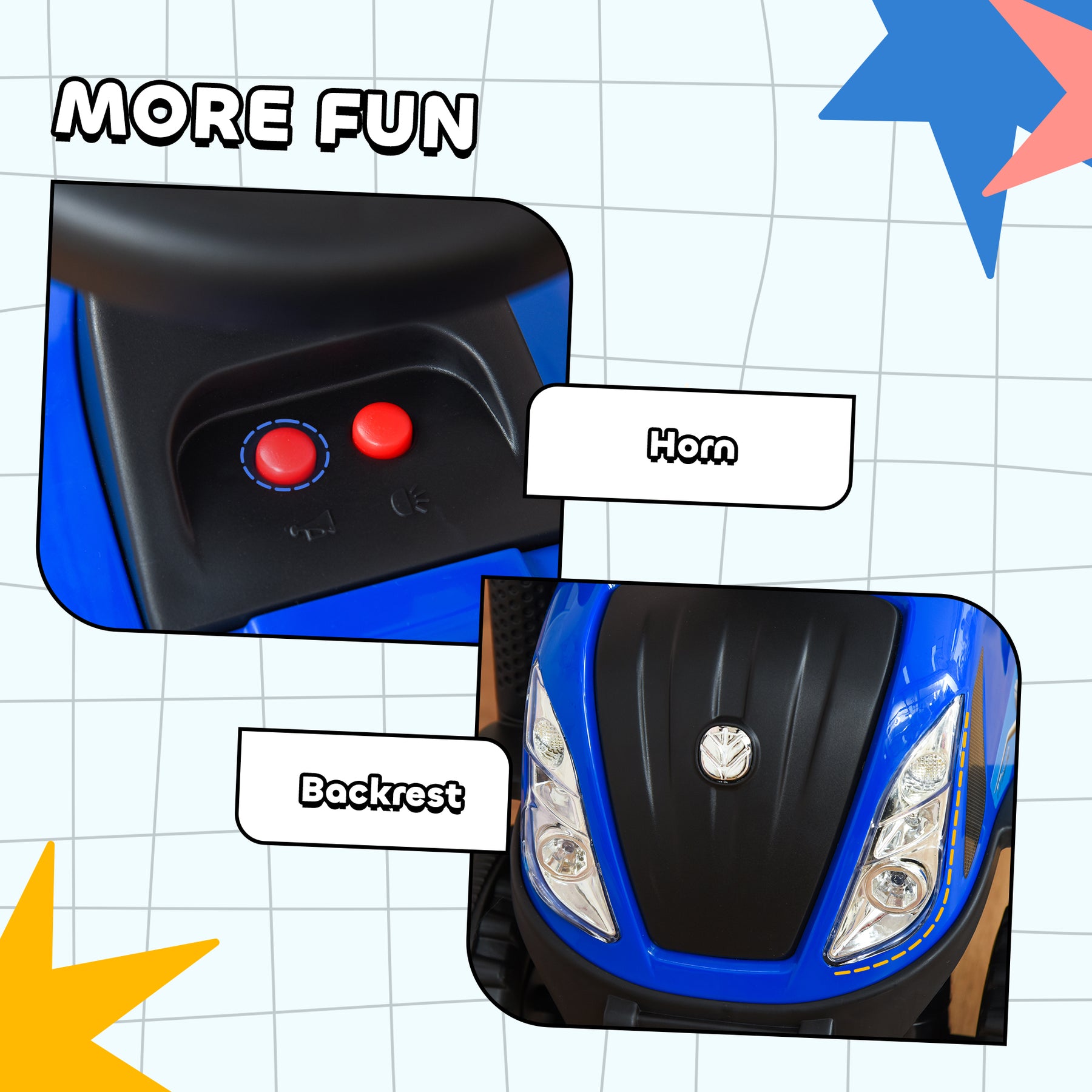 - Horn and toy safety lights for realistic fun