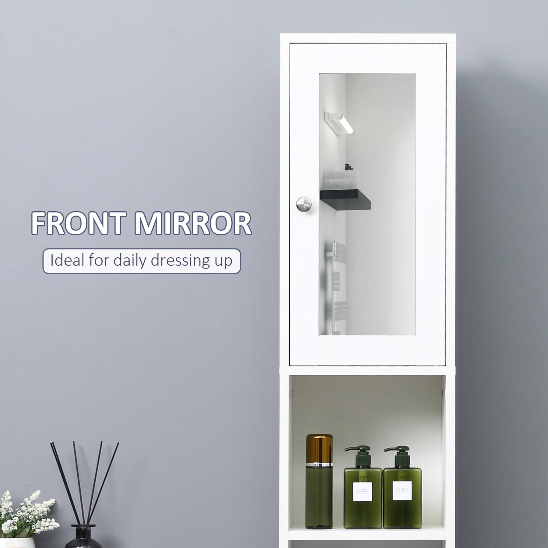 Still looking for more storage space for your bathroom or entryway? With 2 open shelves and 2 cupboards with adjustable shelves inside, this floor cabinet offers lots of storage space for you. Featuring a mirror on the top door, this tall narrow cabinet provide you a place to dress up. The framework made of quality particleboard is sturdy and durable. Besides, the anti-toppling design adds extra stability. Enjoy a more organized space with this storage unit from MCL.