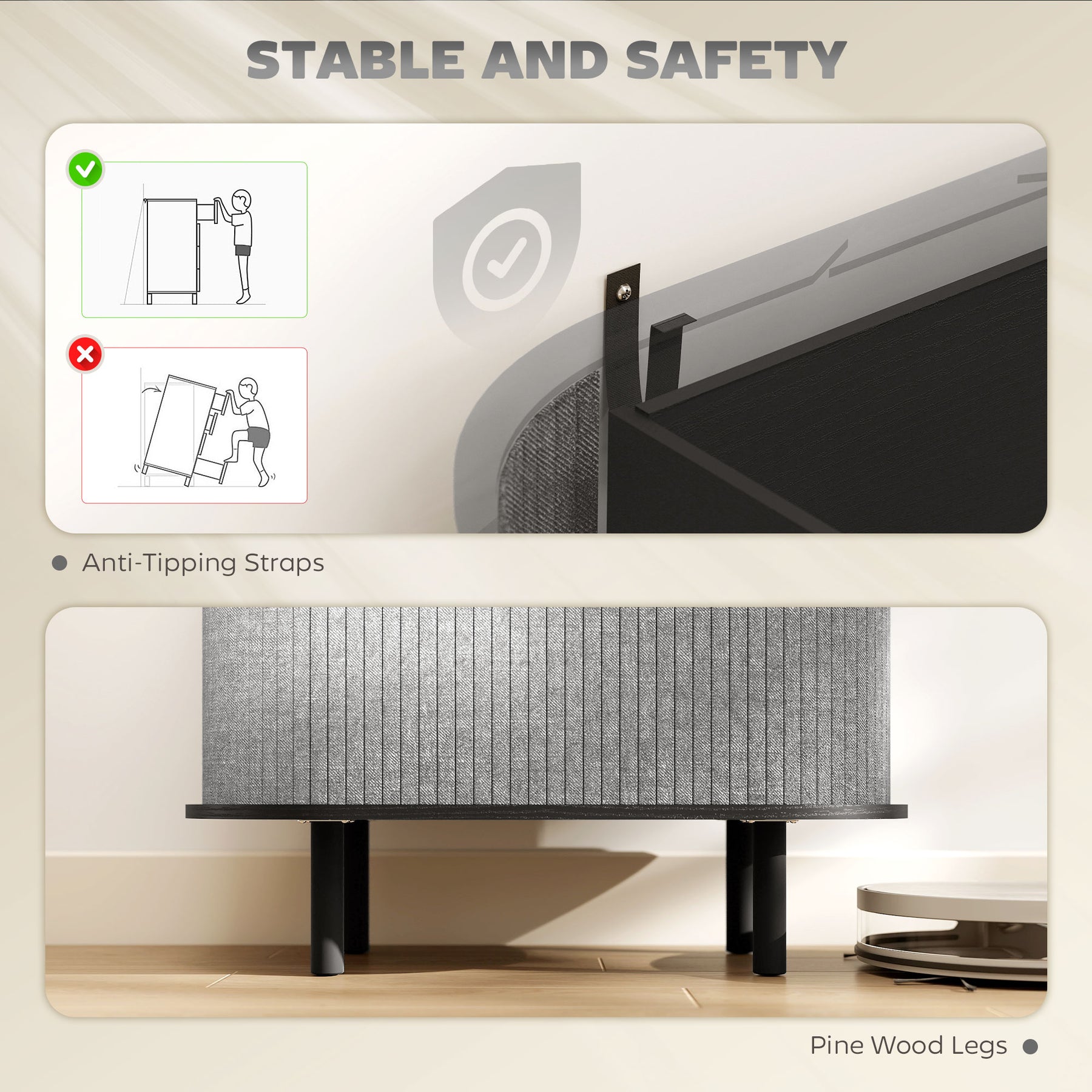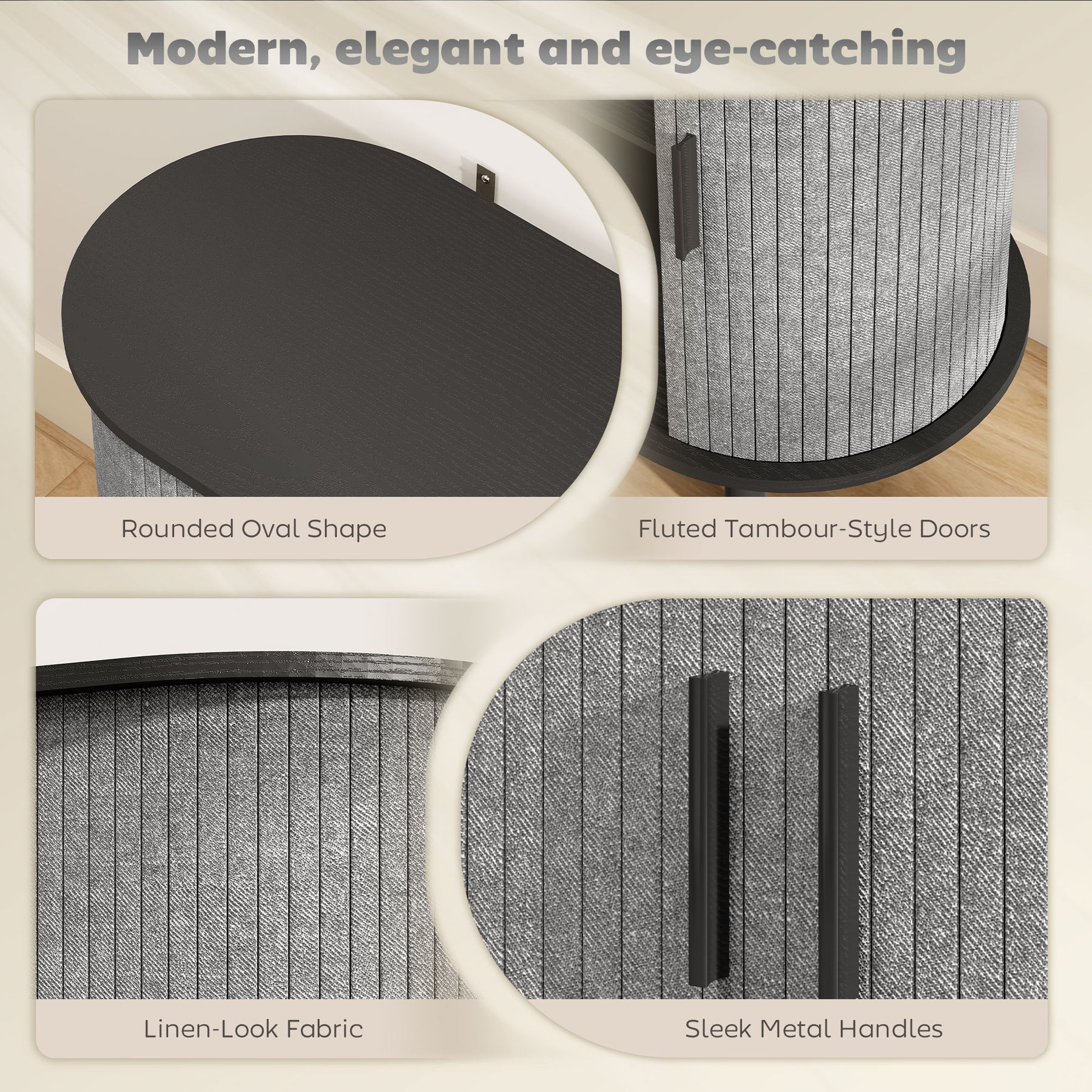 Looking for a beautiful way to display your favourite decorations? This oval sideboard from MCL does more than store—it showcases. With smooth curves and fluted tambour-style doors covered with linen-look fabric, the buffet cabinet brings subtle texture and warmth to any space. Slide open the doors to hide clutter and keep the top clear for candles, vases, or framed photos. Great for elevating your living room, hallway, or dining area.