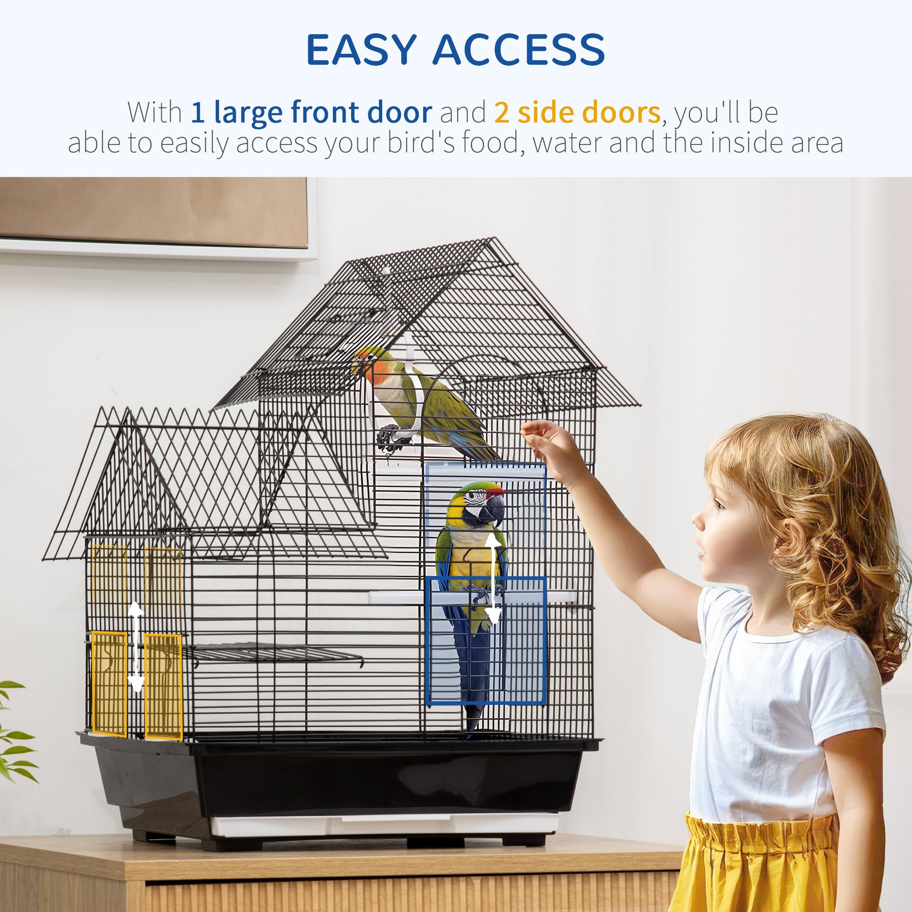 Upgrade your pet's home with this bird cage. Birds will rest on the two perches or the swing ring, where they'll flap and stretch their wings in this comfortable habitat. The pull-out tray at the bottom makes cleaning a breeze, keeping their living space tidy and comfortable. Food and water are provided through the two small doors and food containers, whilst the other large door provides easy access. Invest in their happiness and comfort – and watch them thrive.
