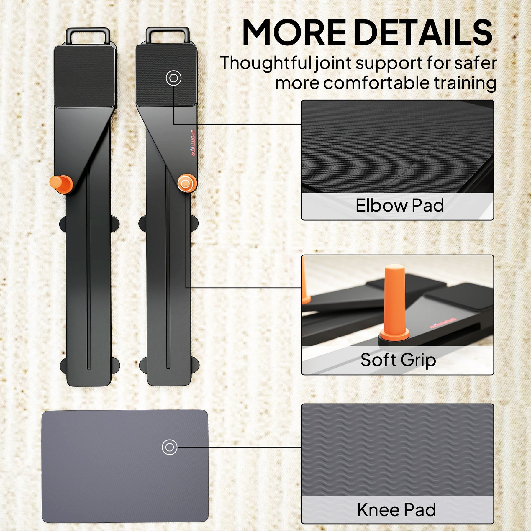 The SPORTNOW multifunctional push up board offers versatile training for push-ups, prone slide and leg glides. Link two boards for standing glide workouts, targeting your full body. Its integrated 63 cm glide rail ensures smooth movements, engaging chest, core and legs effectively. Built tough with 120 kg capacity, soft silicone handles, elbow and knee pad for secure, comfortable grip. Weighing just 2.8 kg, it's portable and space-saving - great for home gyms or on-the-go workouts.