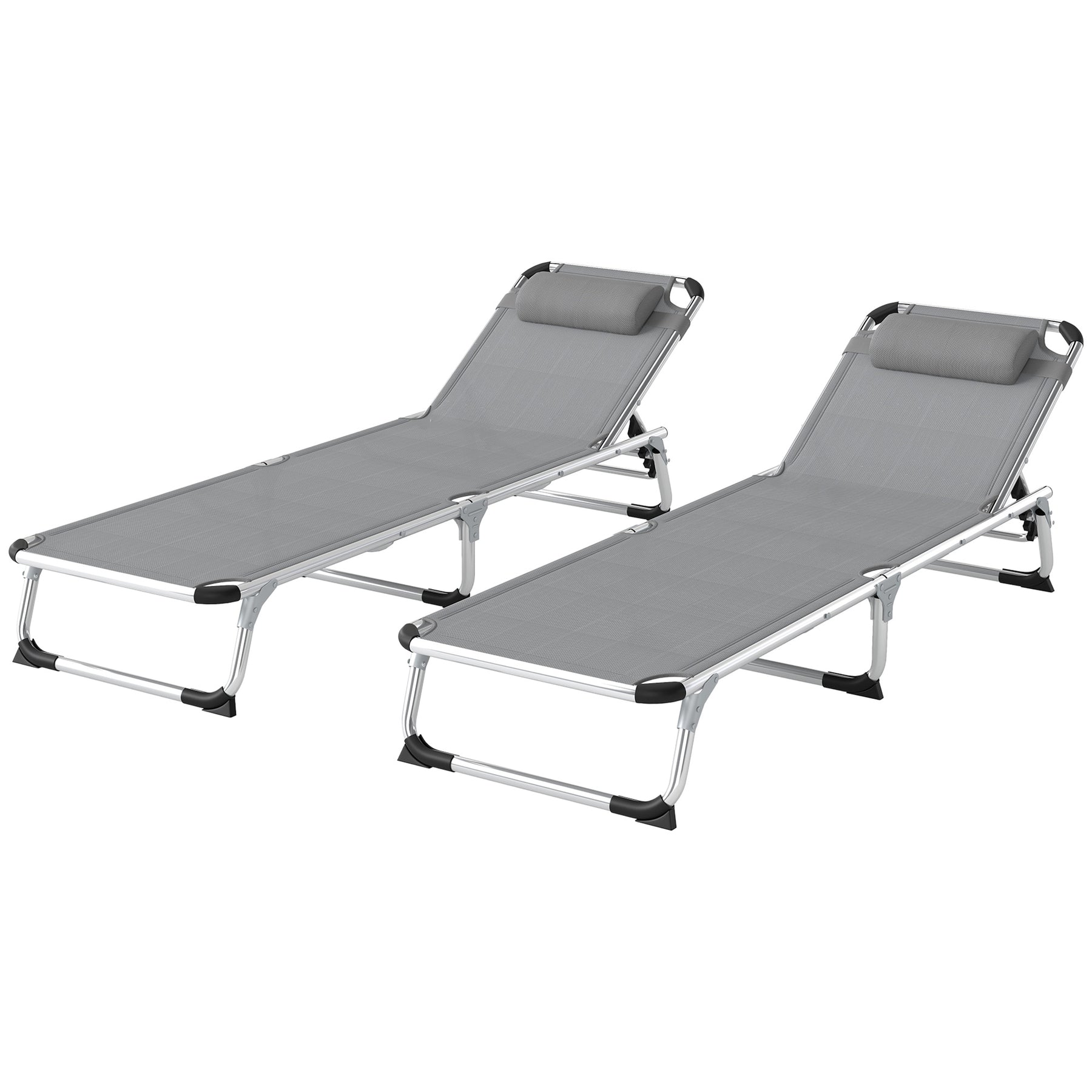 Outsunny Foldable Outdoor Sun Lounger Set of 2, Reclining Lounge Chair Camping Bed Cot with Pillow 4-Level Adjustable Back Aluminium Frame, Light Grey